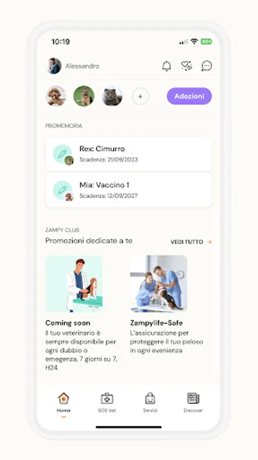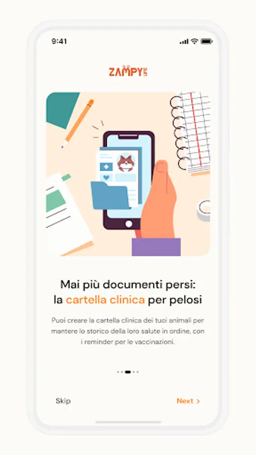 ZAMPYlife permette di creare una tessera sanitaria sull’app e condividerla con il veterinario con un semplice “tap”. Ti avvisa con un “alert” quando è il momento di effettuare una vaccinazione.