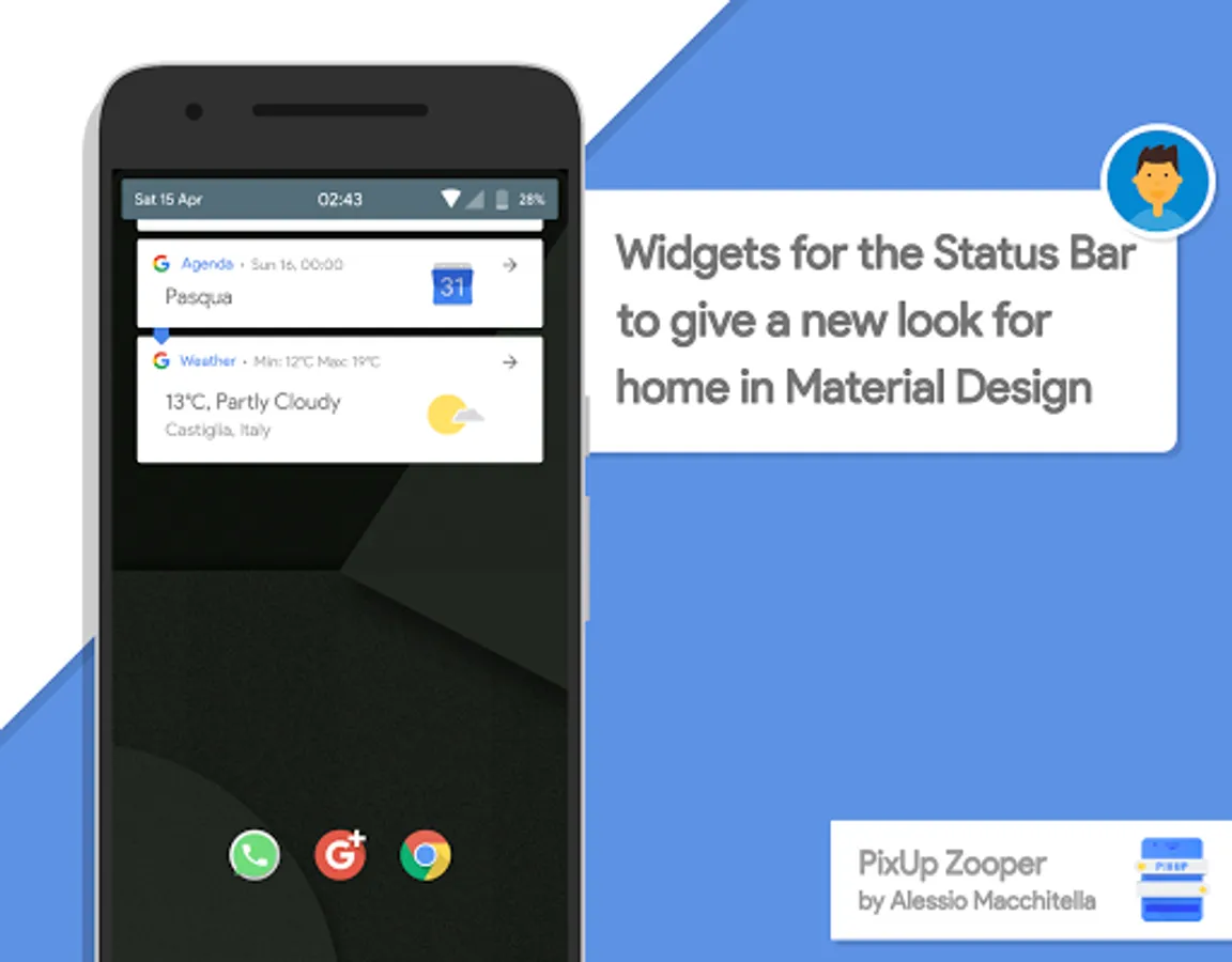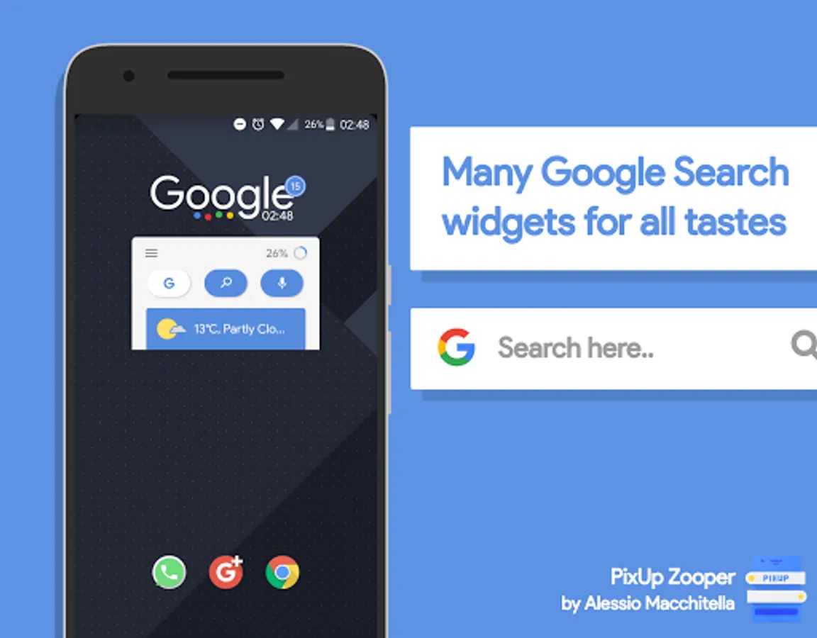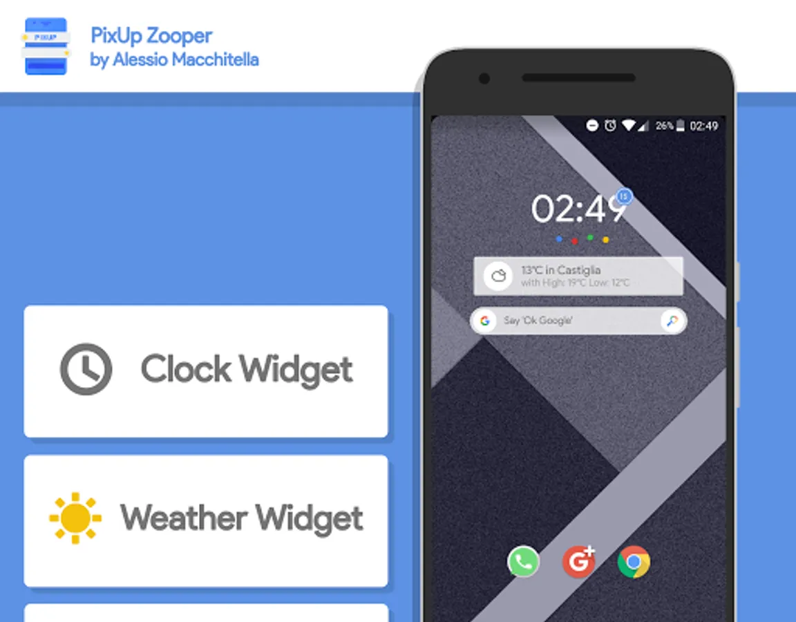 - The shortcuts apps in PixUp Zooper are: Google Apps, Google Calendar, Chrome, Google+, Google Maps, Phone / Camera / Gallery / Music / Settings (Samsung), Clock (Google), Whatsapp, Gmail, Weather Timeline and Shortcut Nova Launcher .