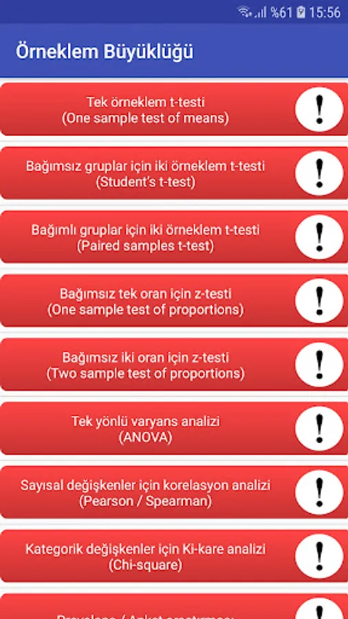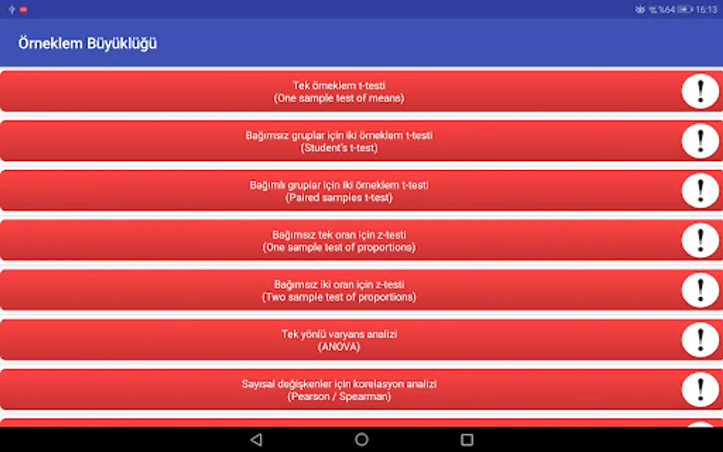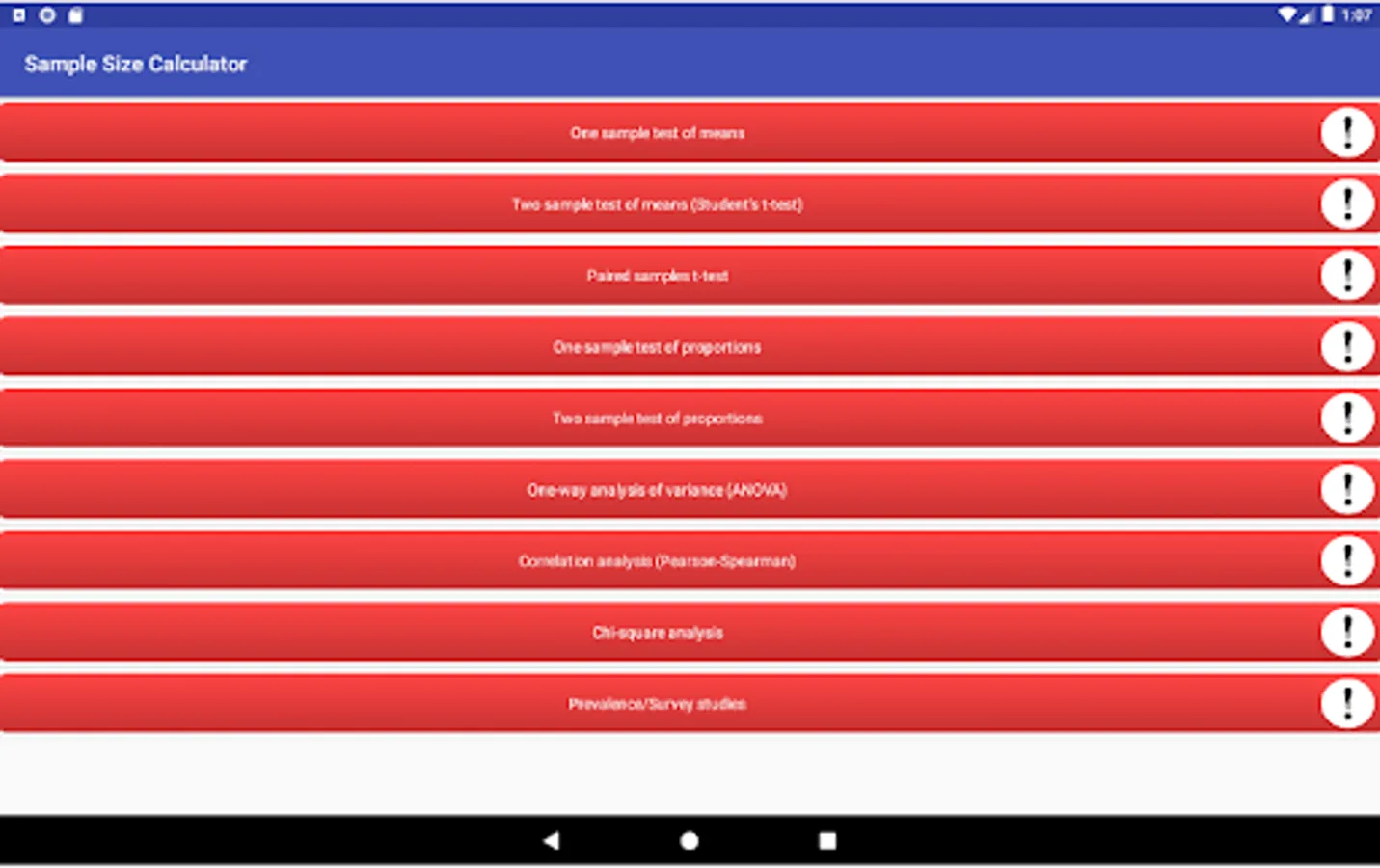 With the mobile application, the required sample size for the following statistical tests, which are widely used in many researches, can be calculated.