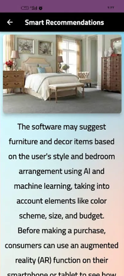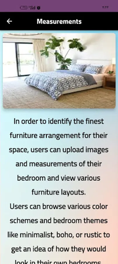 By placing their phone in the room and viewing the design of the selected room as though it were already there, users of the program can choose ready-made bedroom designs and apply them to their actual rooms using augmented reality technology. Additionally, users can utilize the interior design capabilities in the application to decide on the room's measurements, the placement of the furniture and accessories, the management of the lighting, and the colors and fabrics.