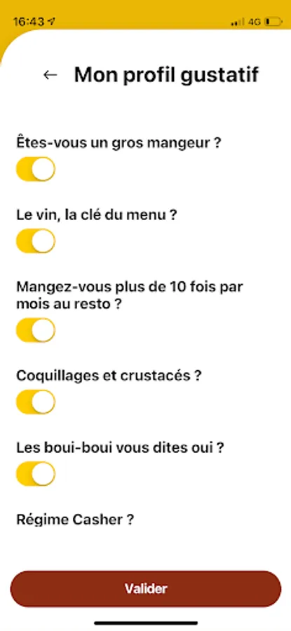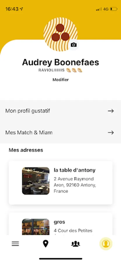 When registering, the user fills out an interactive questionnaire, which will help determine their taste profile. Vegan, Chinese cuisine fanatic, natural wine enthusiast, with dietary restriction or even a heavy eater, each user can enter their dietary preferences and needs. It is thanks to the taste profile that users can trigger Match & Miam.
