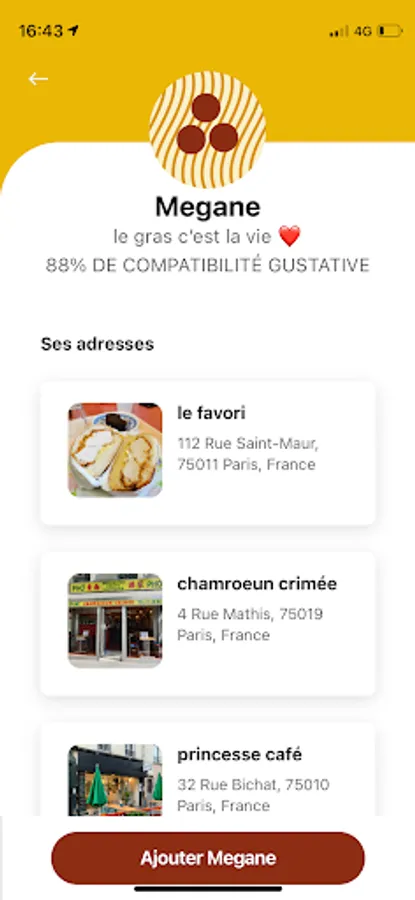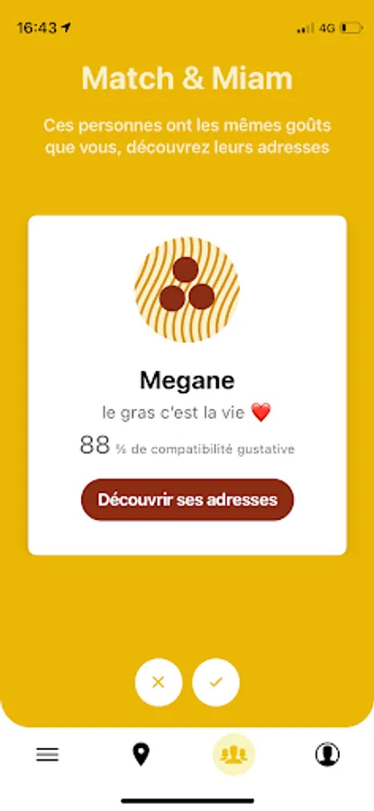 True innovation in the digital prescription sector, this is the flagship functionality of the application. Via a matching algorithm, the Match & Miam allows users to create their taste community by adding other users with similar profiles, whether in their neighborhood or in a new city, they can stock up on good addresses with the assurance of obtaining ultra-personalized recommendations, which really correspond to them.
