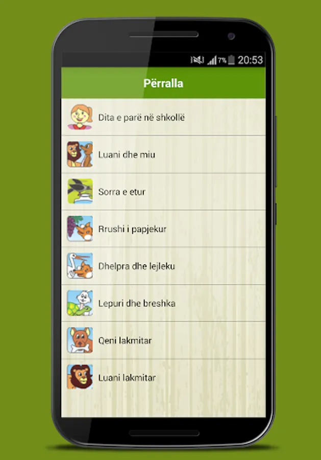 Në këtë aplikacion mund të gjeni shumë përralla dhe kuize përkatëse për çdo përrallë. Përrallat janë me ilustrime dhe me zërim që e bën shumë më të lehtë mësimin e tyre. Ky aplikacion është në gjuhën shqipe dhe atë angleze.