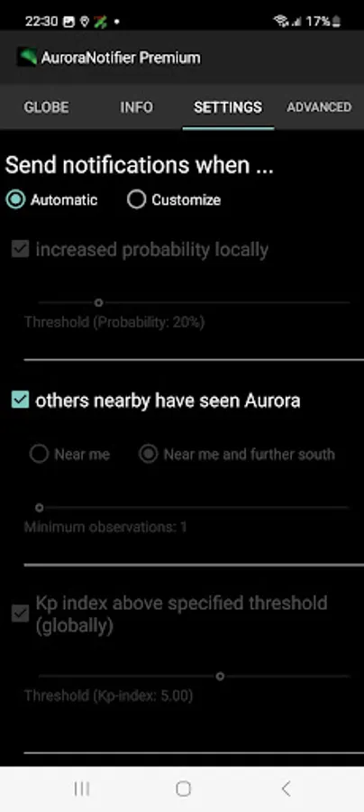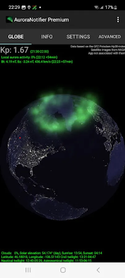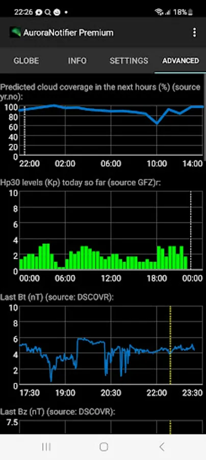 The premium version which can be bought within the app itself offers some more technical information and graphs of Kp-index predictions, cloud cover and solar wind parameters - and some hidden features.