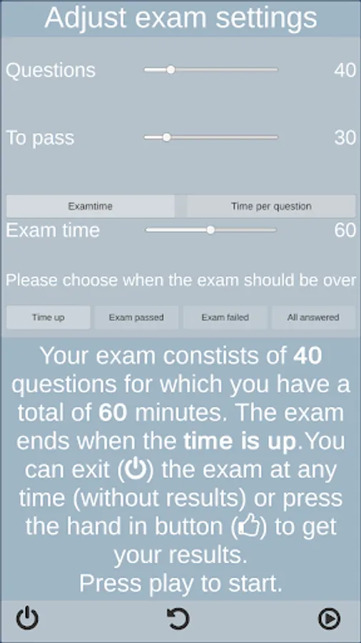1. Standard exam: 100 random questions in 60 minutes, passing rate 90%