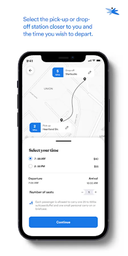• By default, your closest pick-up and drop-off station has been chosen, tap the continue button to book your ride or tap on the pencil icon on the map to change pick-up and drop-off stations.