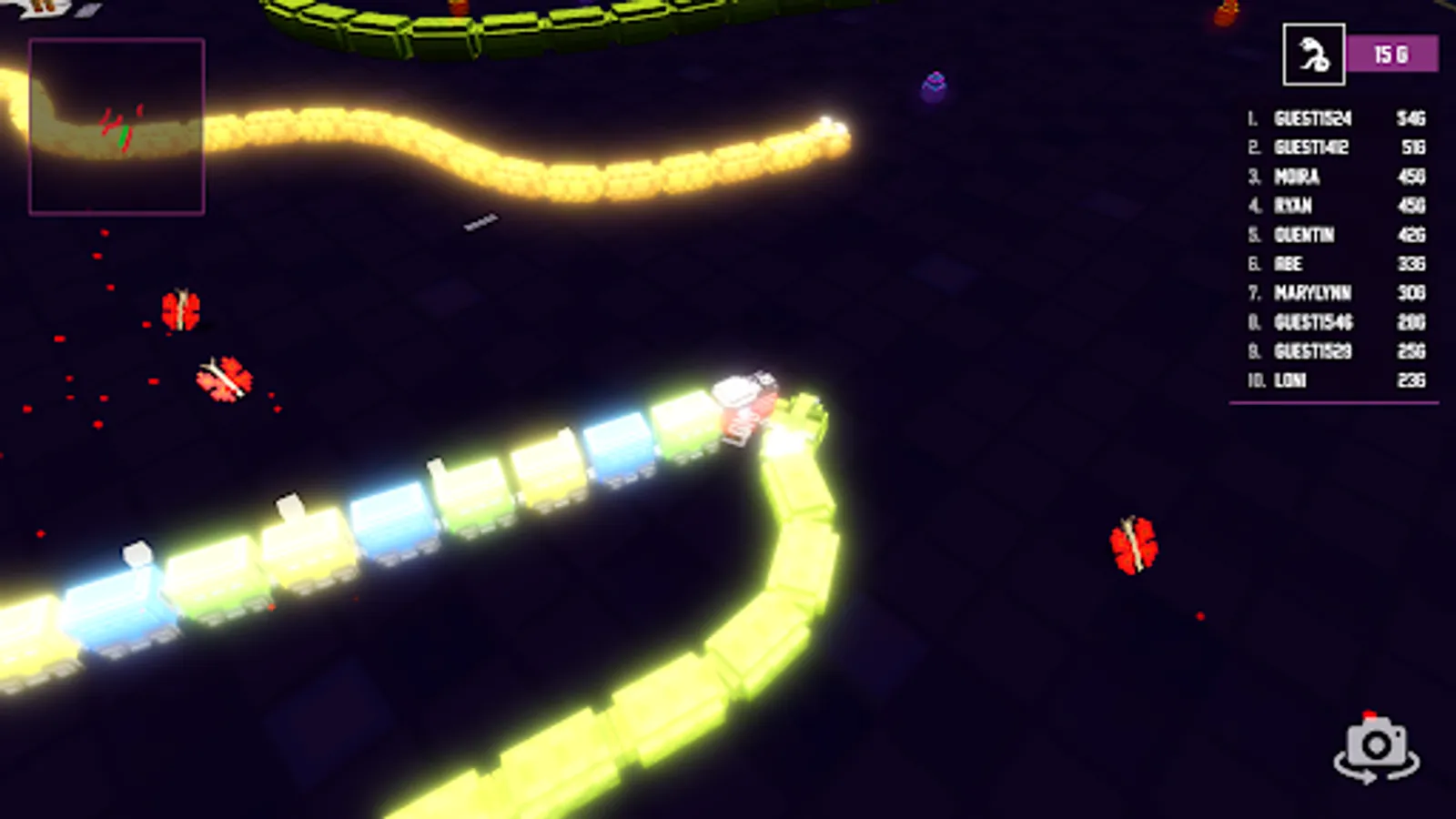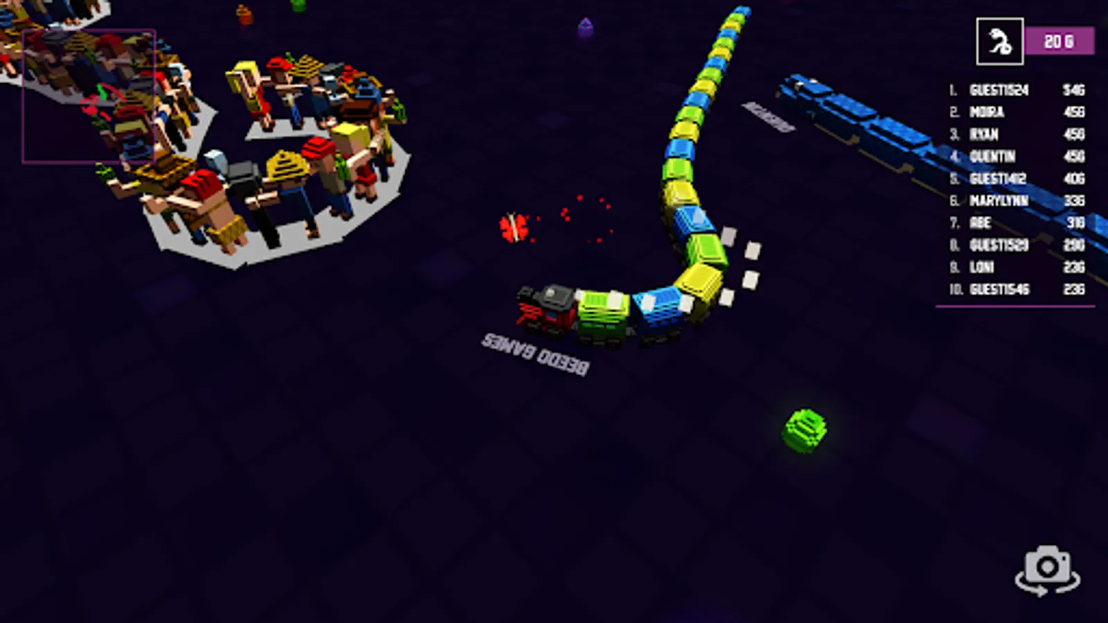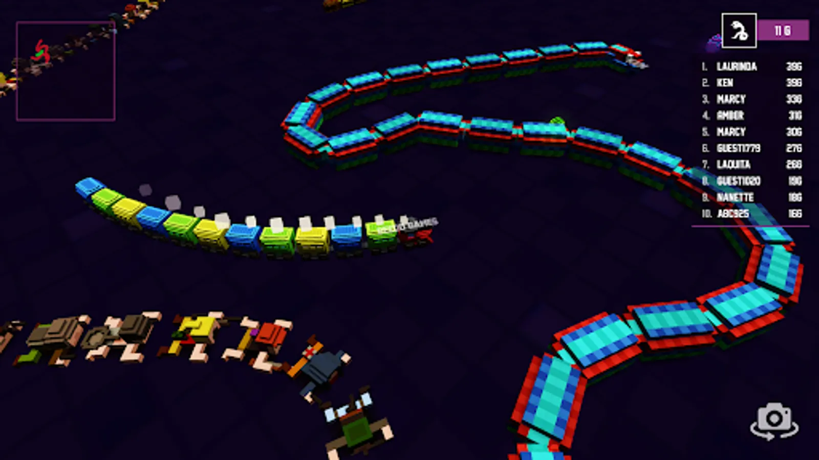 Blocky Snakes is a battle arena game where you have to eat all kinds of candy spread over a map to grow bigger and bigger. Make sure not to crash into other snakes or you will be eaten.