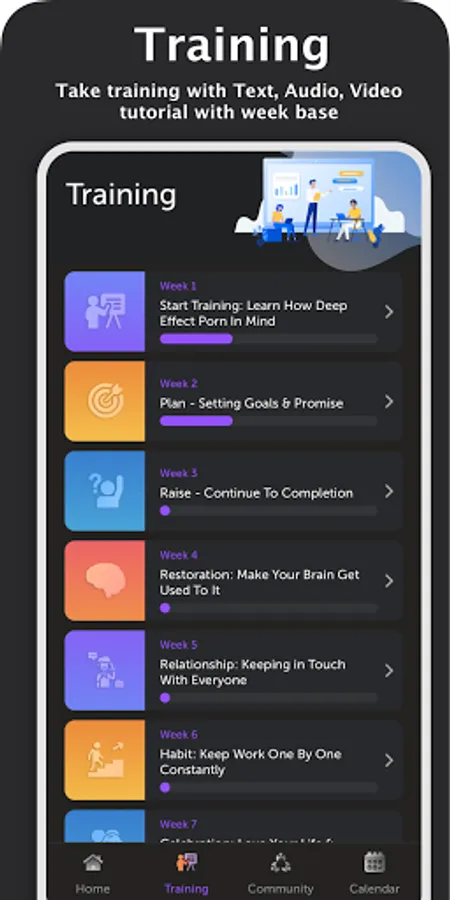 We have researchers, neurologist, therapists, and other mental health experts to develop series of innovative training videos, audio, and motivation text with week goal.