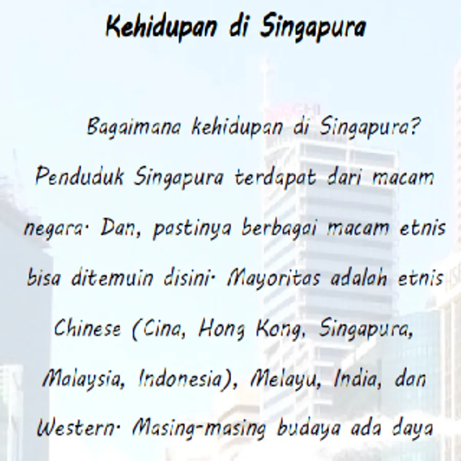 The contents of this book are things related to life in Singapore. Like the price of food, transportation, shelter. And tourist attractions that are often visited in Singapore. In addition, there is also info that I share with readers if readers are interested in staying and working here.