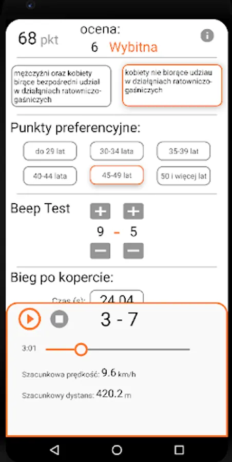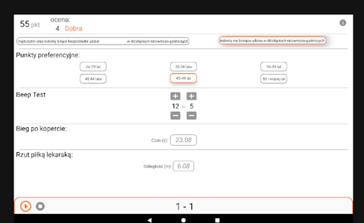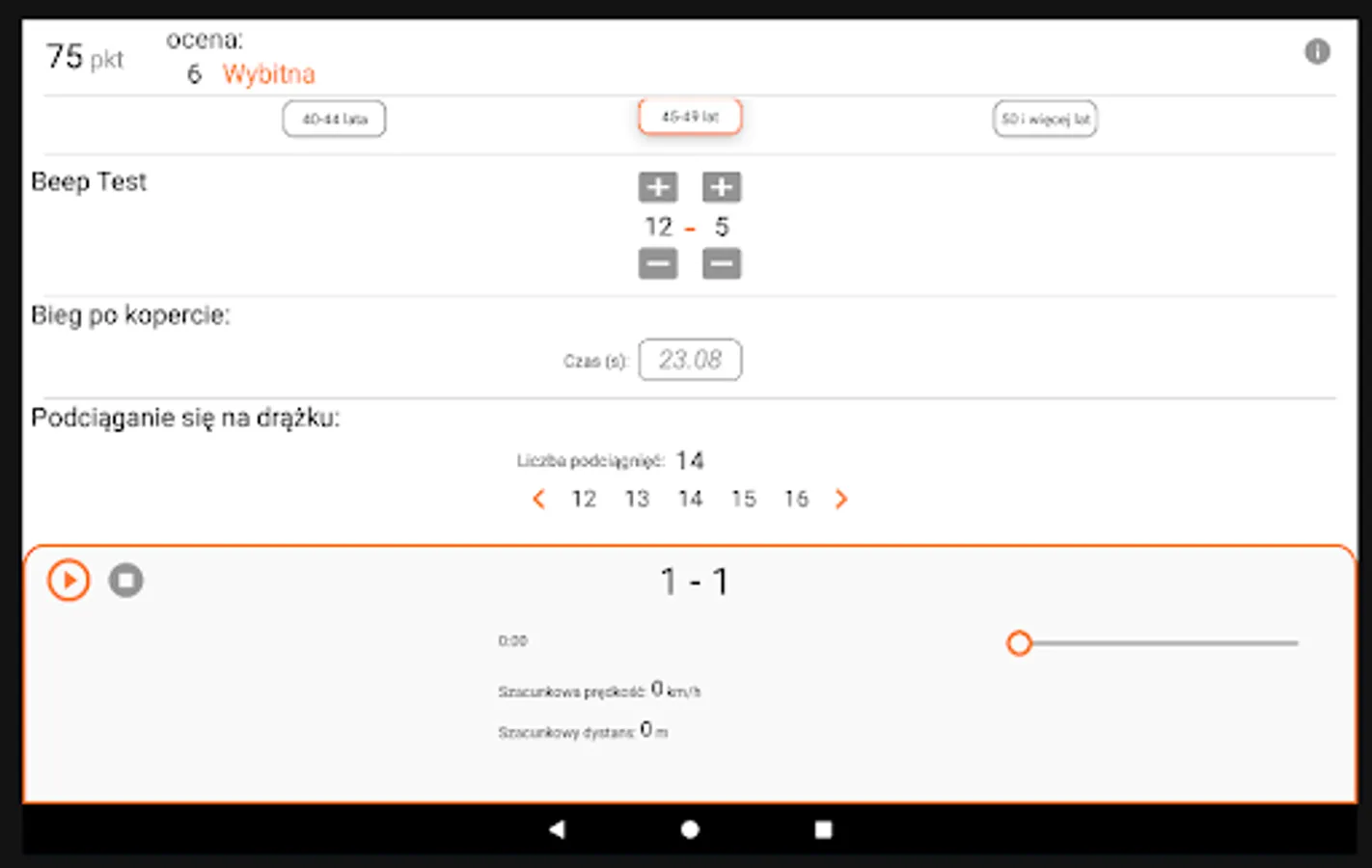 Application for periodic assessment of the physical fitness of firefighters of the State Fire Service in accordance with the latest legal act. It also has an audio player with the official "Beep test" mp3 file available on the KG PSP website. The application can be used both for training and for the exam itself.