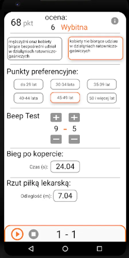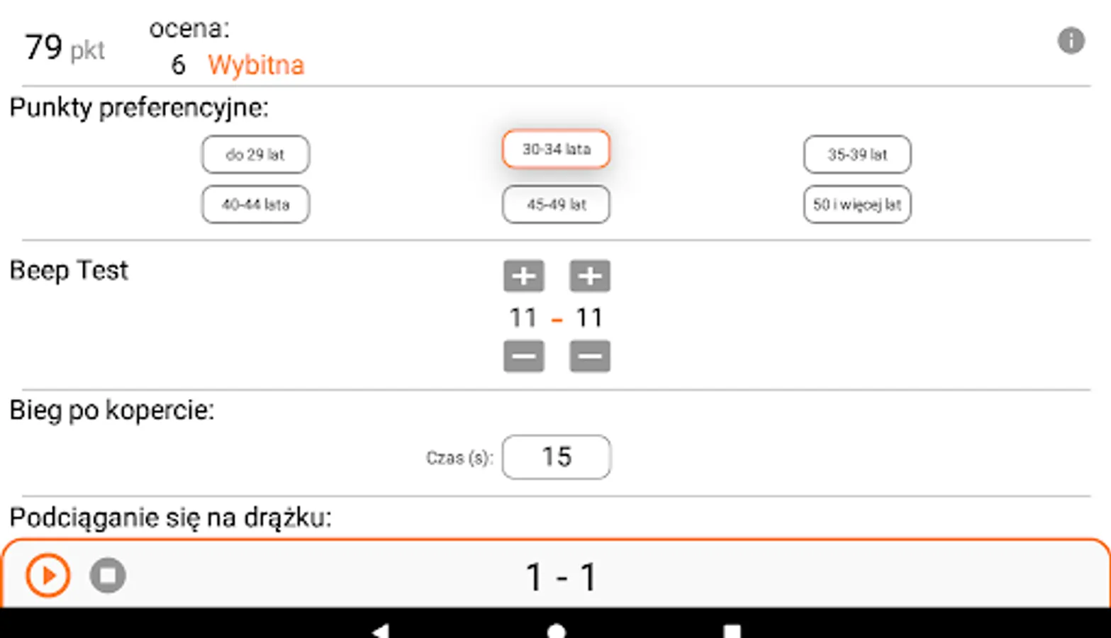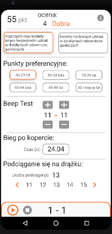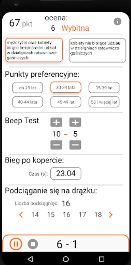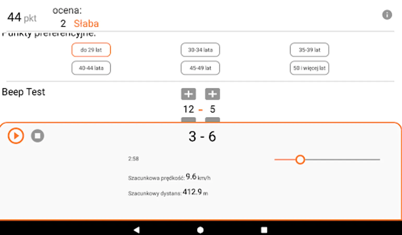 Application for periodic assessment of the physical fitness of firefighters of the State Fire Service in accordance with the latest legal act. It also has an audio player with the official "Beep test" mp3 file available on the KG PSP website. The application can be used both for training and for the exam itself.
