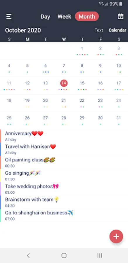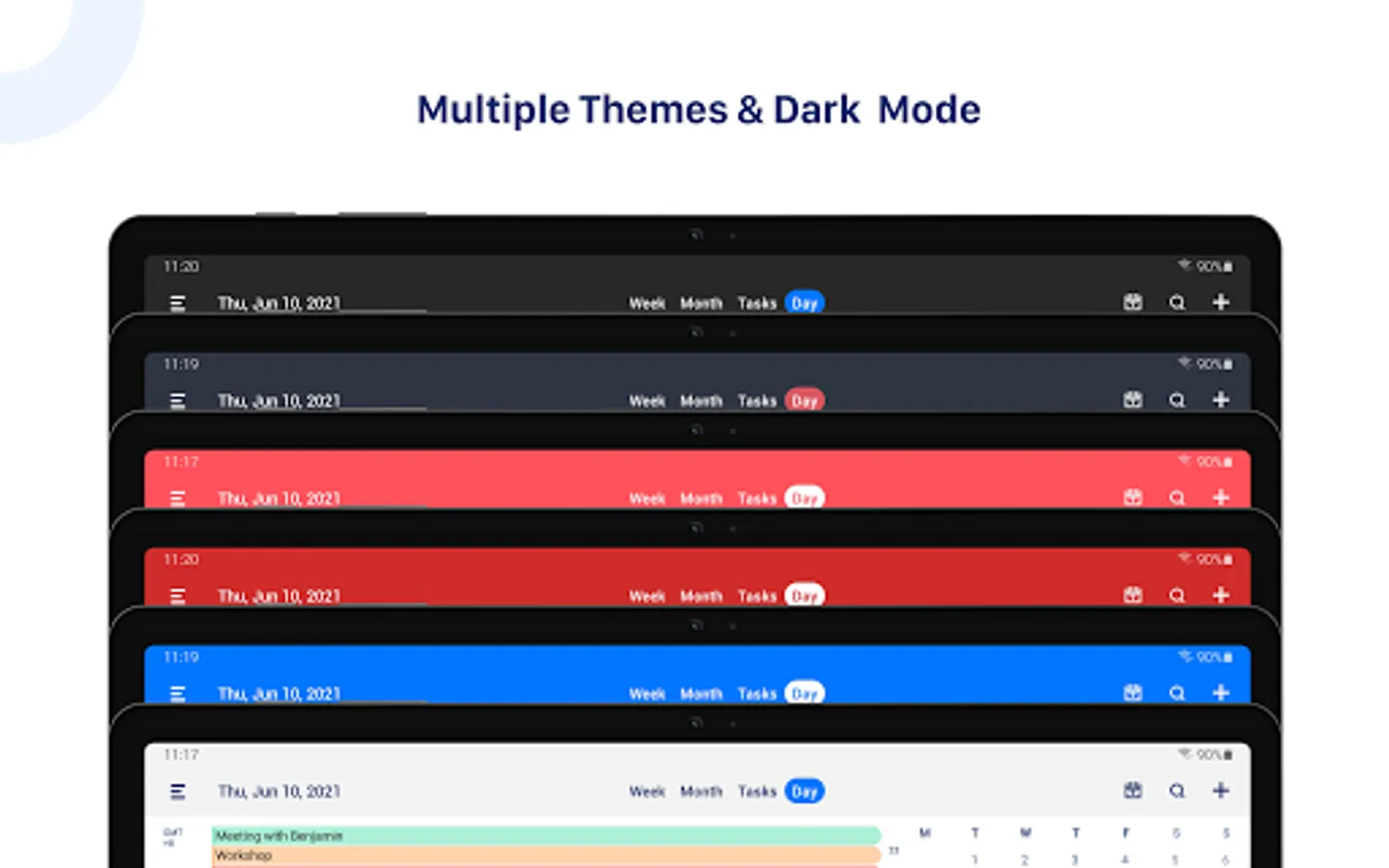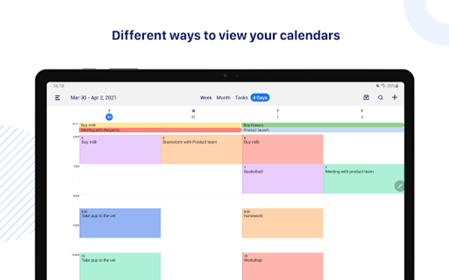 Tiny Calendar supports 8 standard views - day, week, month, 4-days, year, mini-month, week agenda and agenda. You can instantly switch views to discover events or find a time you're looking for.