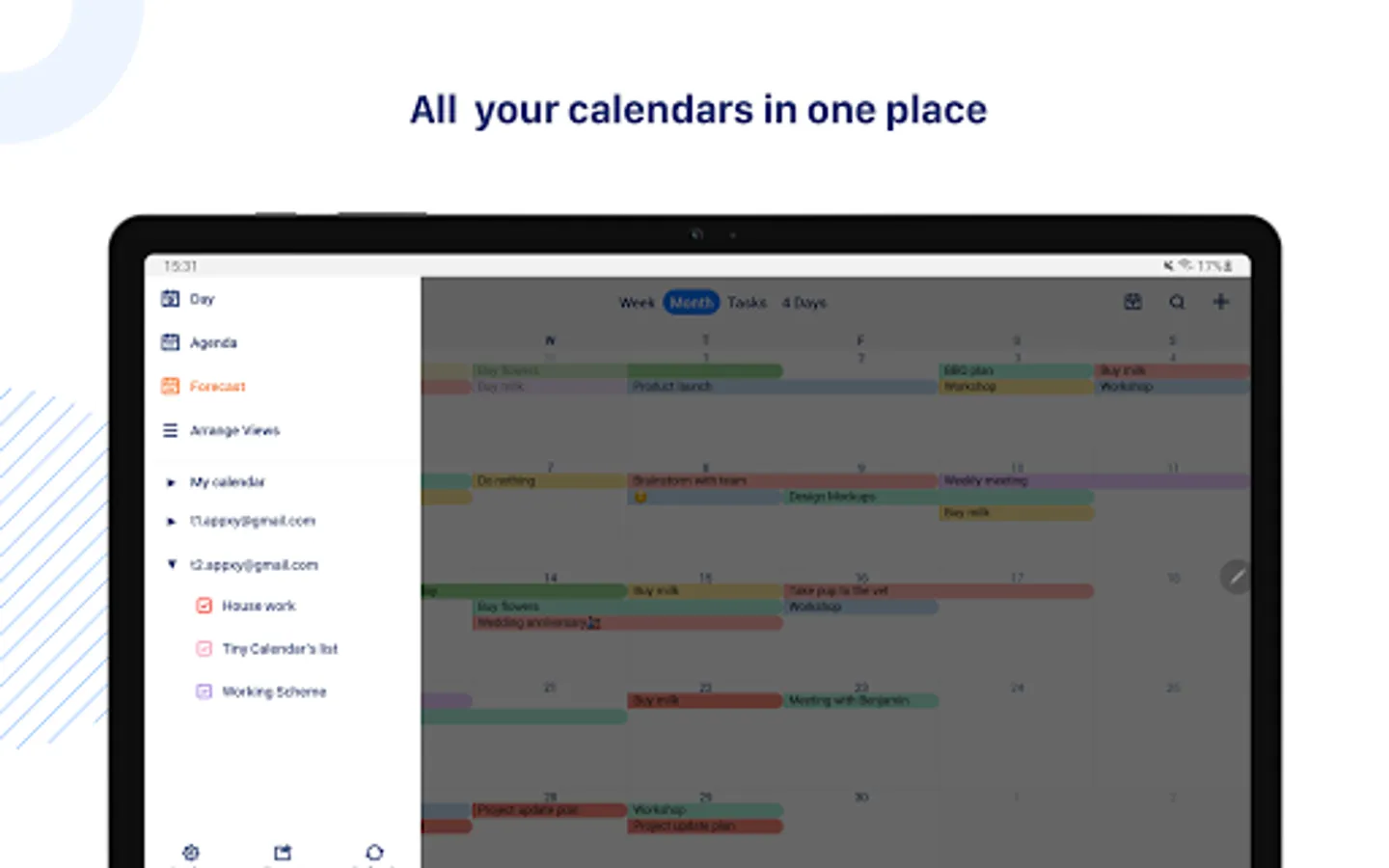 Tiny Calendar is an intuitive smart calendar works with all your calendars. It inherits the simple and clean look of calendars but makes it more accessible, powerful and reliable on your android phone. With Tiny Calendar, you can access and manipulate your calendar events more easily, anyway you want.
