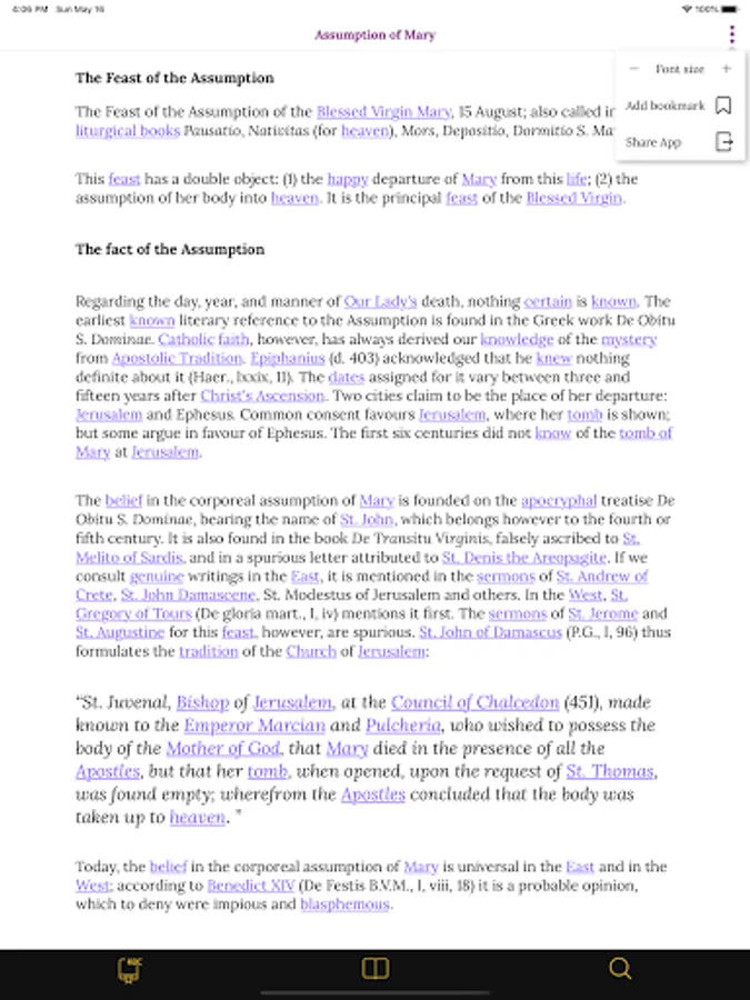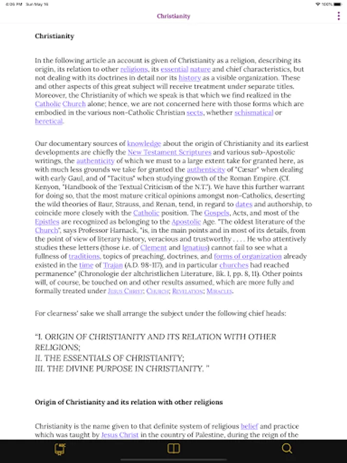 This app brings you the famous Catholic Encyclopedia book with an optimization for mobile devices. More than 16 000 articles are accessible through a very simple and intuitive user interface. After installation no Internet connection is required and all readings are available offline.