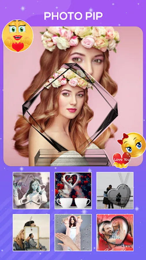 In photo in photo feature it allows you to give your pictures a complete new look. PIP Selfie Photo Editor you can create your photos extra beautiful with multiple creative frames and collage layouts! There are plenty of effects like Crystal Bottle Pattern, Heart Shape, Frames Series, Person Style, Simple Style, and Cartoon Style. With PIP Camera photo editor user will makes their photo artistic just by using different frames like photo glass, mobile screen, heart, hand, mirror, selfie camera and more.