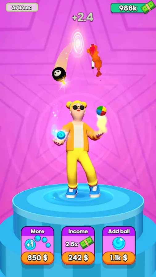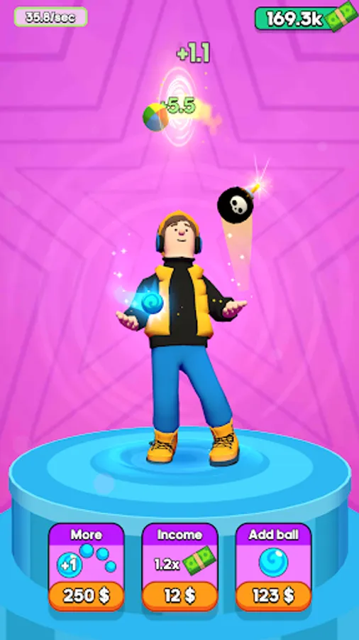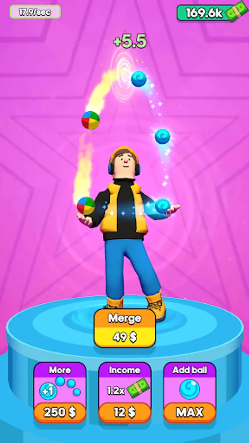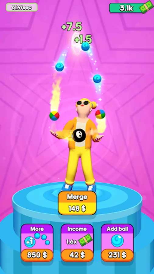 Choose your character who will juggle for you. Buy objects and start juggling! You will see how things that you throw, will fly through the magic money portal that gives you cash every time objects fly in. You can spend your honestly juggled money to upgrade different options like boosting your income from each object, increasing the number of juggled objects, or even merge them into more interesting ones! What do you want to juggle - a ball, a bomb, or a hamster?! Don't struggle - juggle!