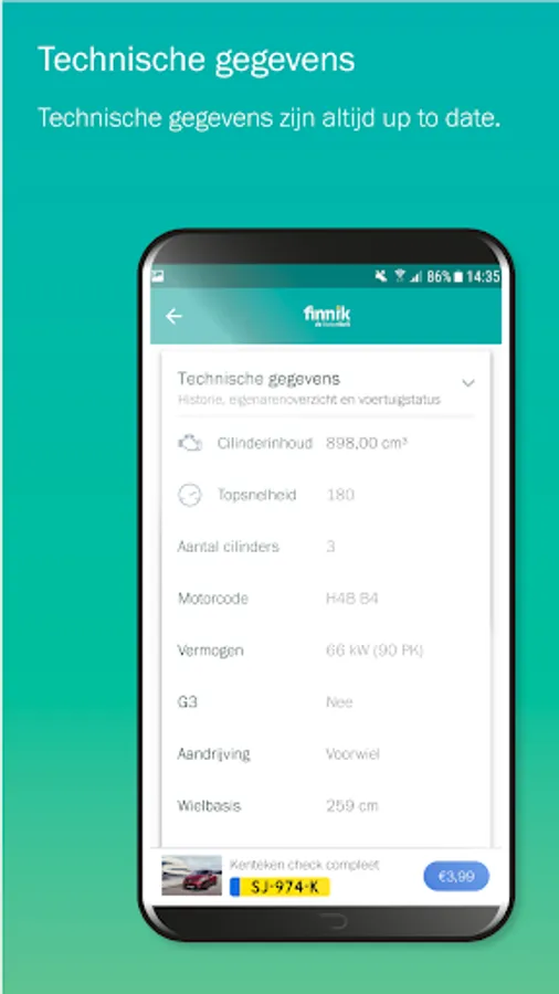 Download the free app, fill in a Dutch license plate and quickly view all car data about your favorite car brand: Tesla, BMW, Volvo, Mercedes, Volkswagen, Renault, Toyota, Opel and much more! Finnik's license plate check is useful if you want to buy or sell a car, but it is also ideal for car spotters.