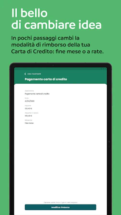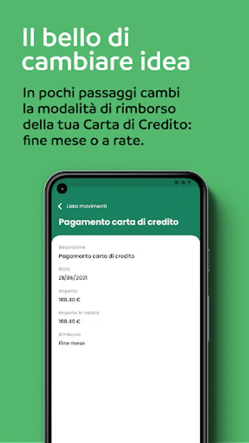 In just a few steps, you can change the repayment method for your purchases and cash withdrawals made with your Card, directly from your mobile phone, choosing the payment method you prefer between installments and the end of the month.