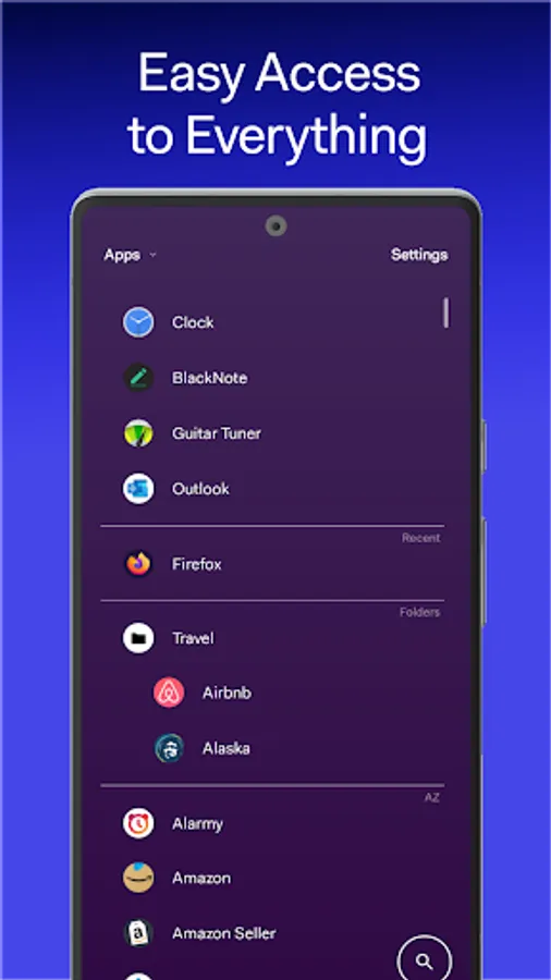 Fast access to all your apps in a scrollable, sortable & searchable list.