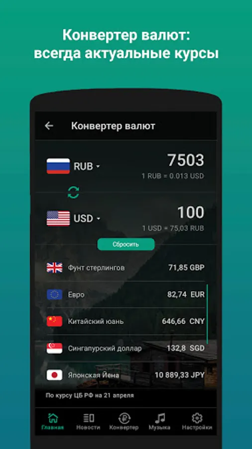 Customize the application for yourself: add 3 currency pairs to the converter, choose a nice audio and video background, or simply turn on your favorite radio station.