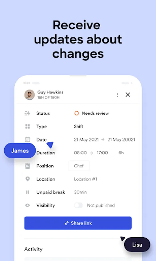 - Receive upcoming shift reminders and latest activity updates to your email inbox