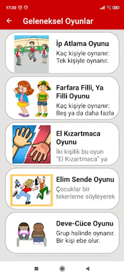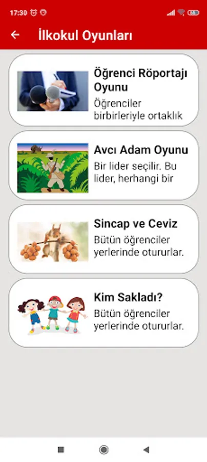 With the games in our application, you will have a good time with your children (Teachers with their students). In our School Games Guide application, there are traditional games such as hide-and-seek, hand-frying, leapfrog, jumping rope, camel dwarf games, as well as today's games such as squirrel and walnut, who is hiding, student interviews, and there are explanatory information on how to play these games.