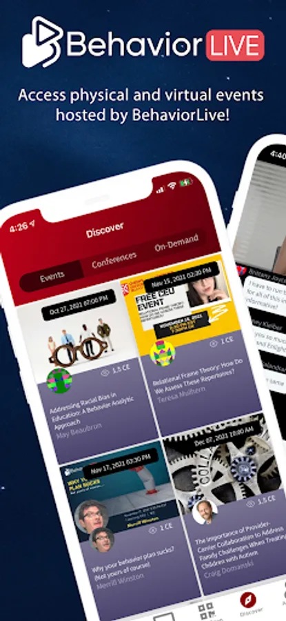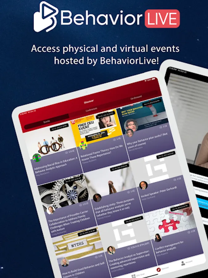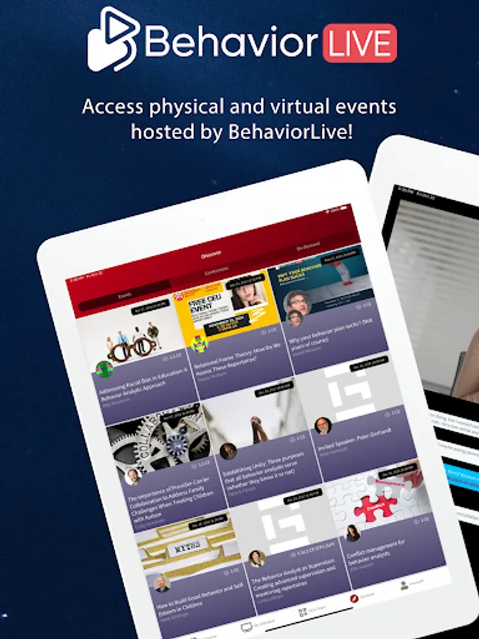 Introducing the BehaviorLive app! A seamless experience for live events and CEUs. Users of the app can participate in conferences & events virtually and physically! If you are on-site, scan the QR code to check into an event, and then join the "virtual" room to connect with your online peers and chat, ask questions, answer polls and much more during the sessions. A fully immersive experience for live events!