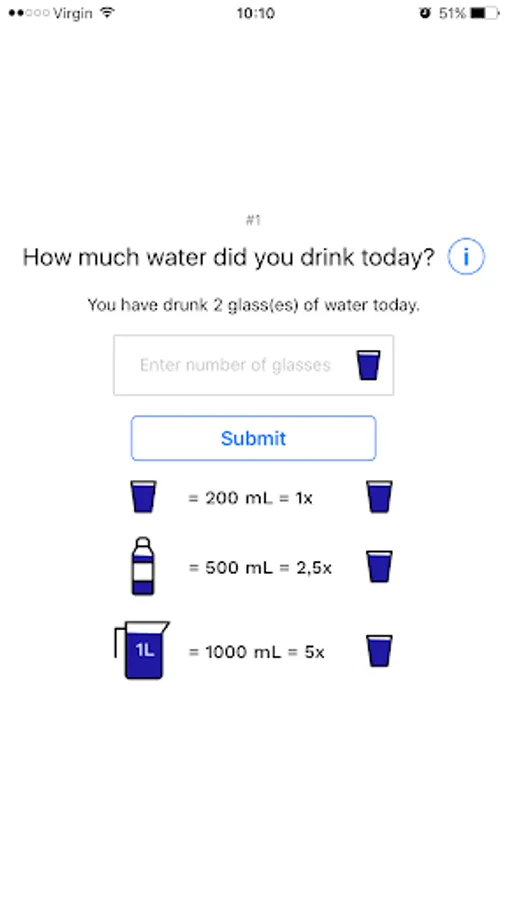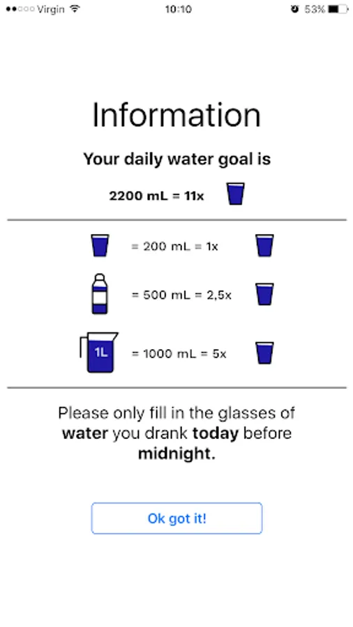 Mywaterintake helps you to achieve the daily recommended water goal, as set by the Mayo Clinic. The amount of water you consume everyday plays an important role in maintaining a healthy body. Mywaterintake is based on the latest scientific behaviour evidence and its minimalistic designs helps you to achieve your water goal daily. The latest evidence shows that giving people insight in there previous data reduces motivation for future behaviour (Chan, Song, Sarker & Plumlee, 2017), which is they reason why we’re only showing your current data.