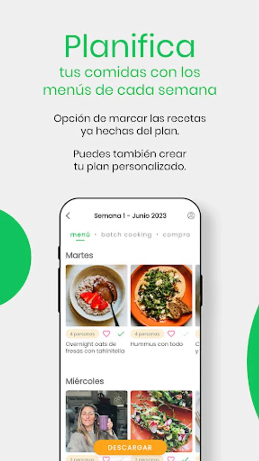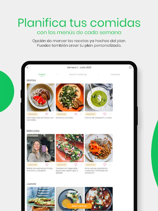 With access to more than 2,000 colorful recipes 🍐 and weekly menus so you can eat easy, fast and tasty every day of the year, with vegetarian-based and gluten-free preparations that you can easily adapt to your current type of diet.