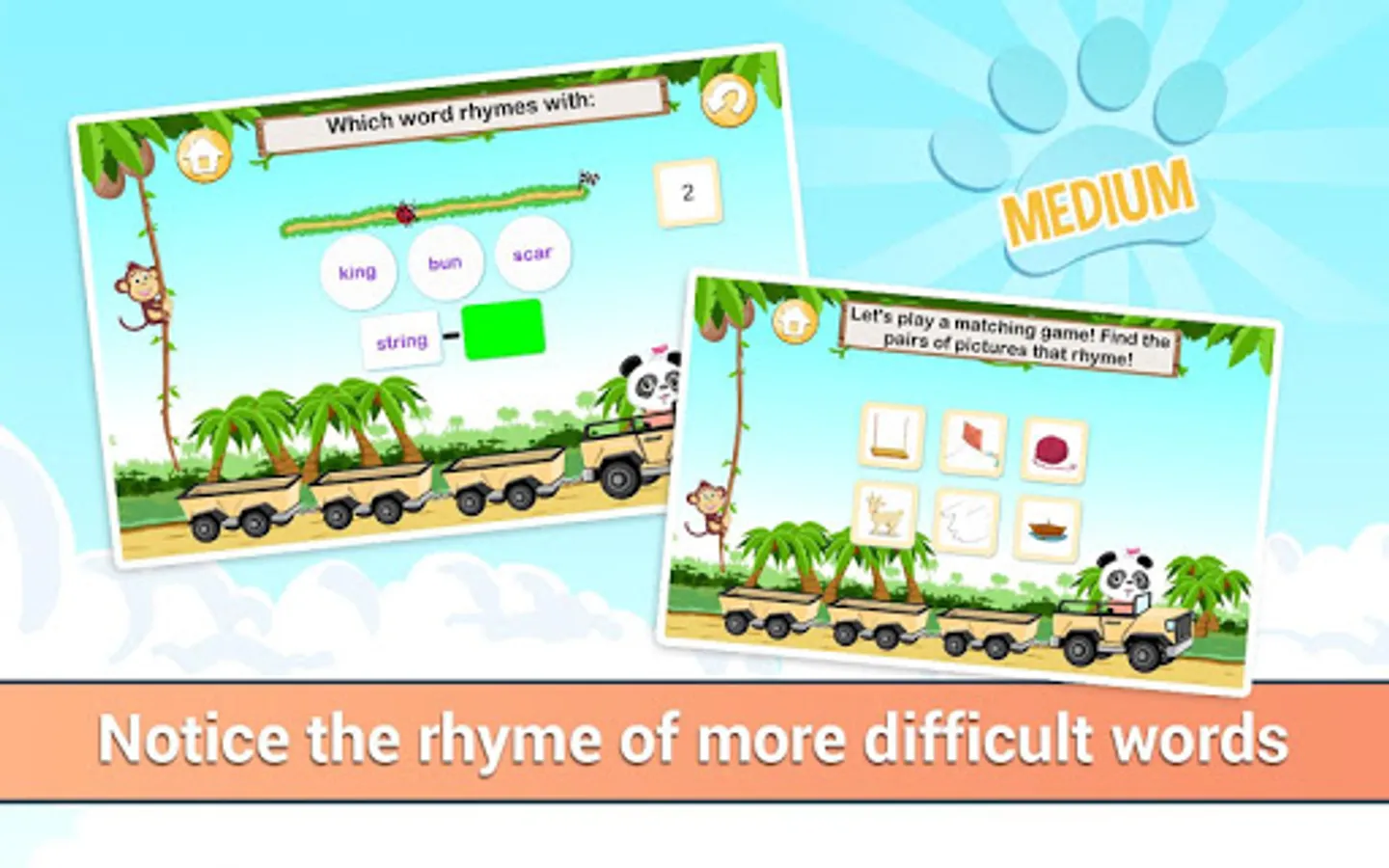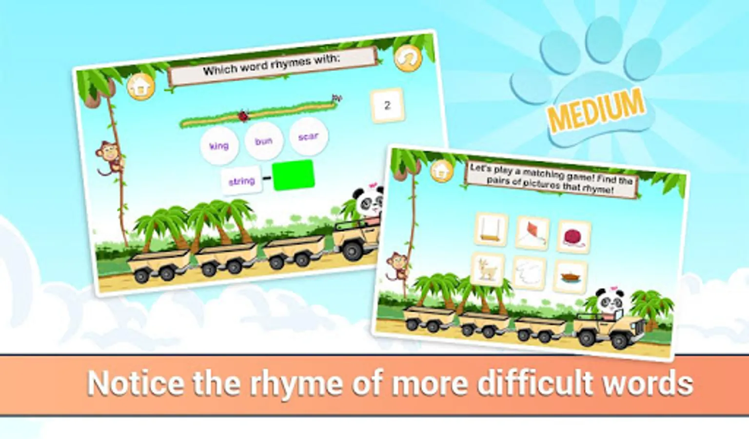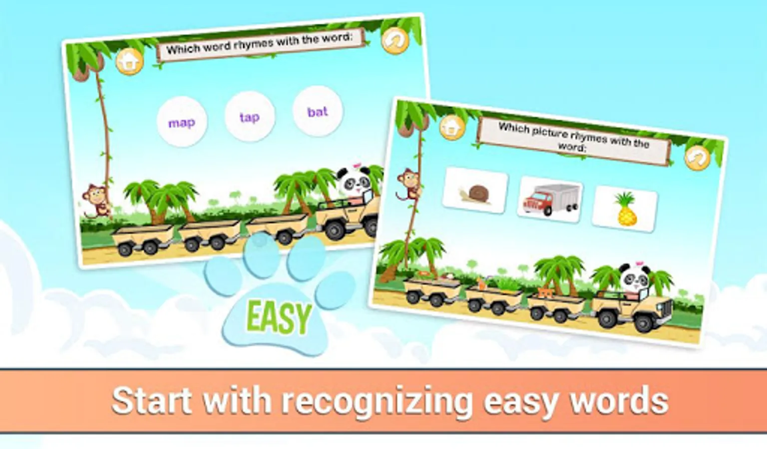 Most preschool kids think it's fun to play with words and rhymes. In this way, kids start their phonological awareness without actually knowing it. A well-developed phonological awareness means that children can switch from one word to another by adding, removing or replacing letters. This is learned in the easy level with the words “hat - bat – rat” and in the hard level with “comb-gnome-foam”.