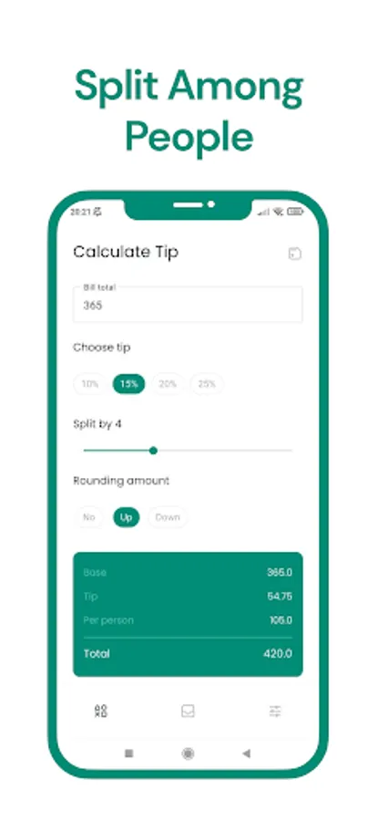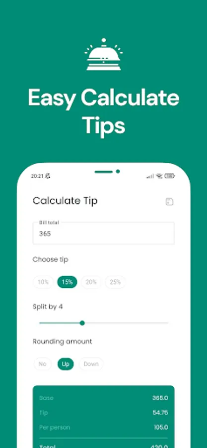 With a clean and intuitive interface, our app makes it easy to enter the total bill amount, select the percentage you would like to tip, and choose how many people will be splitting the bill. Our app will then quickly calculate the tip amount and the total amount each person owes, so you don't have to worry about doing the math yourself.