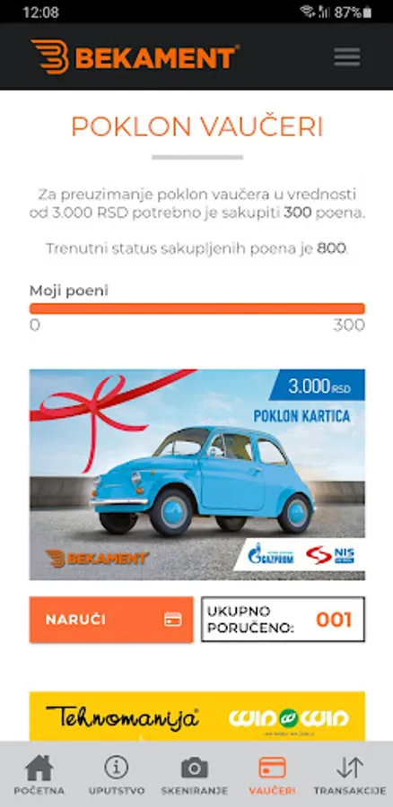 Gift vouchers can be used individually, with each achieved threshold (300 points = 3,000 RSD), or cumulatively, where the participant collects gift vouchers from a selected partner of the Bekament Loyalty program up to a certain amount and then uses them for the value of the collected points, and also has the option surcharges over the collected amount.