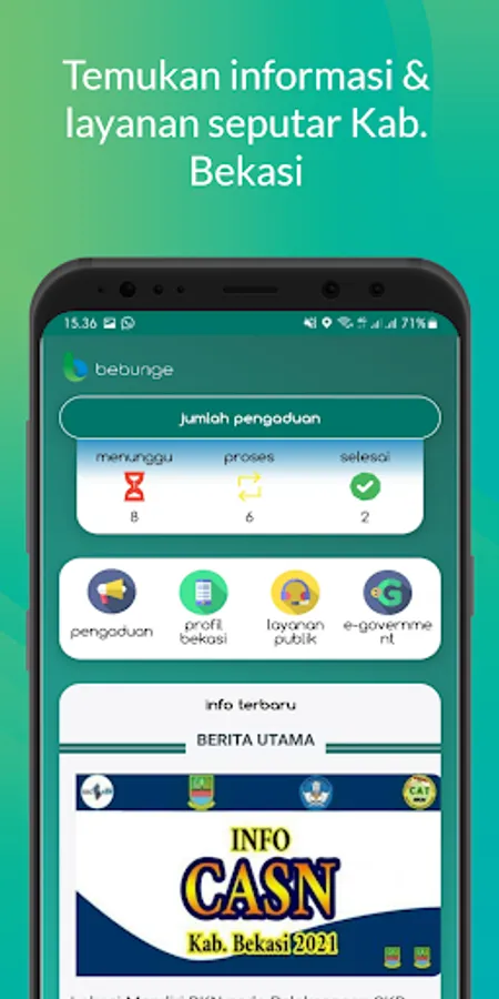 Bebunge is a One-Stop Portal Service owned by the Department of Communication, Information, Encoding and Statistics, Kab. Bekasi. With the Bebunge, the public will get information about government programs and other information. The Bebunge application functions as an application for complaints and aspirations from the community which will then be forwarded to the relevant section for follow-up. Bebunge also functions as a means for the community to enjoy public services provided by the District Government. Bekasi.