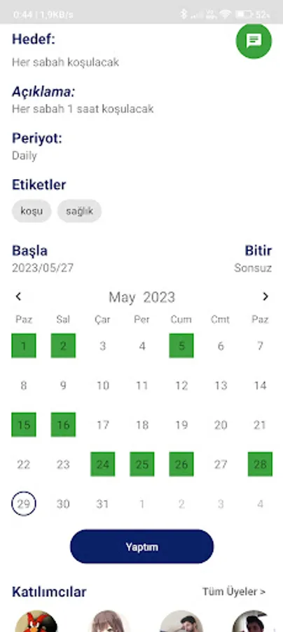 Each goal comes with a dedicated chat group where members can message each other, provide support, and progress together. Additionally, the calendar feature allows you to track and visualize the days you've accomplished under your goals.
