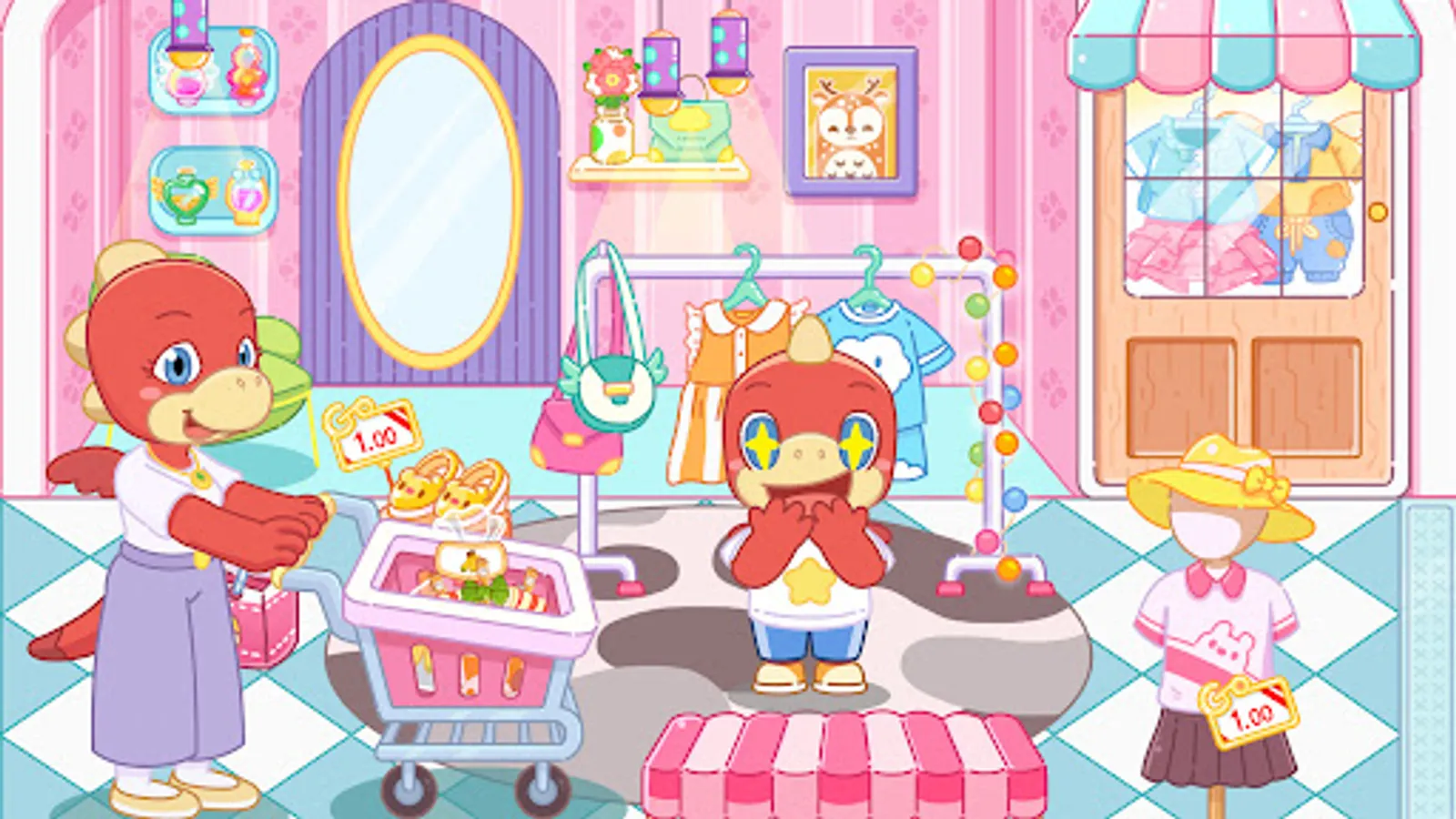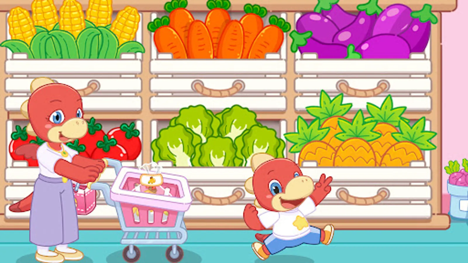 Enter the market each morning, grab your shopping cart, and explore! Walk up and down the aisle to see the colorful stalls, products, and characters.