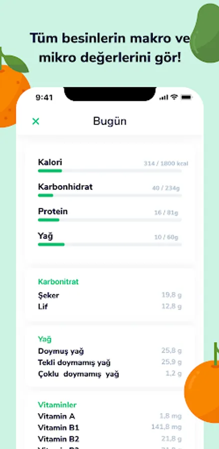 • You can see the sum of the macro and micro nutrient values of all the foods you consume during the day and analyze the food diary in detail.