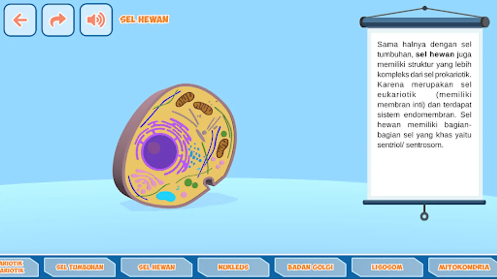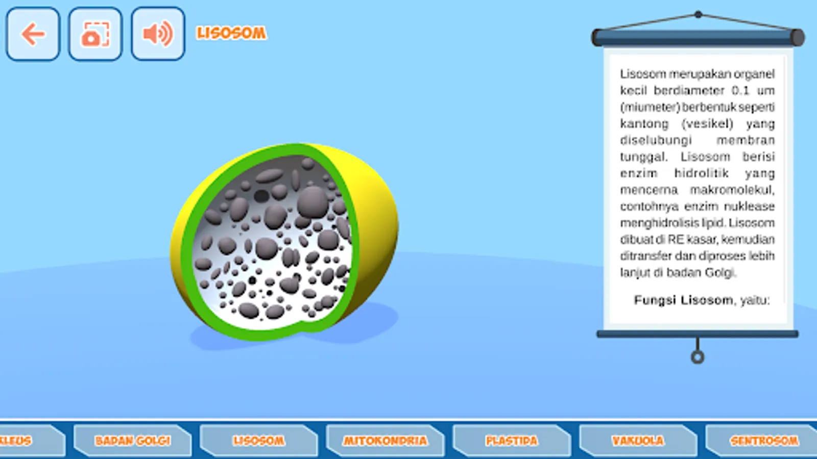 This application contains material on the structure and function of biological cells. The shape of the cell is displayed in 3 dimensions so that it is easier to understand and also becomes more attractive. There is also an explanation with sound so that it makes it easier to learn.