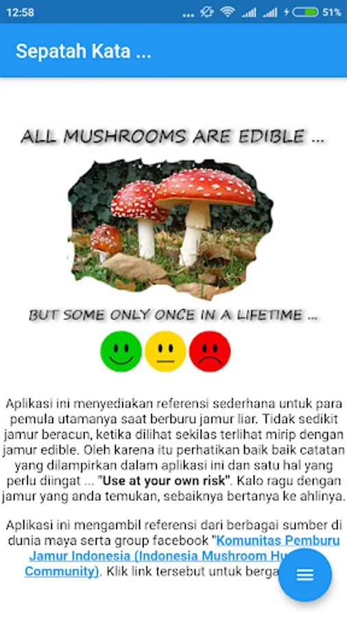 This application provides a simple reference for beginners especially when hunting wild mushrooms. Not a few poisonous mushrooms, at first glance look similar to edible mushrooms. Therefore, pay close attention to the notes attached to this application and one thing to remember "Use at your own risk"...If in doubt about the mushrooms you find, you should ask the experts in the community who have been attached to this application.