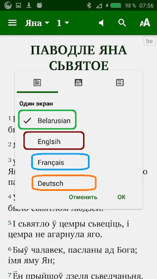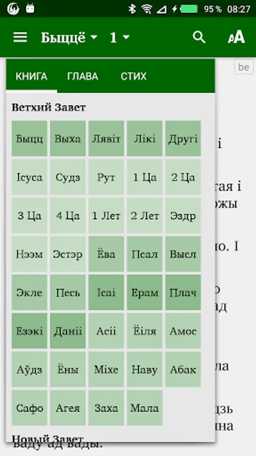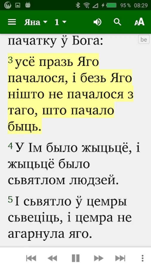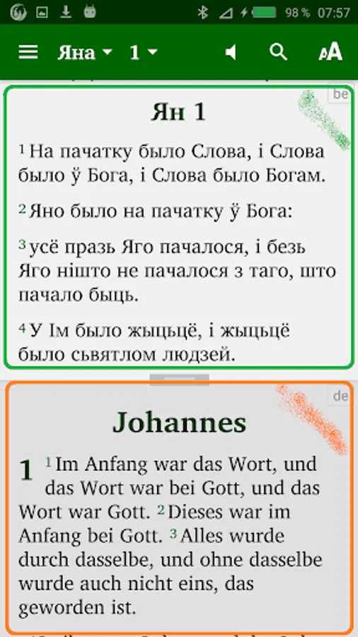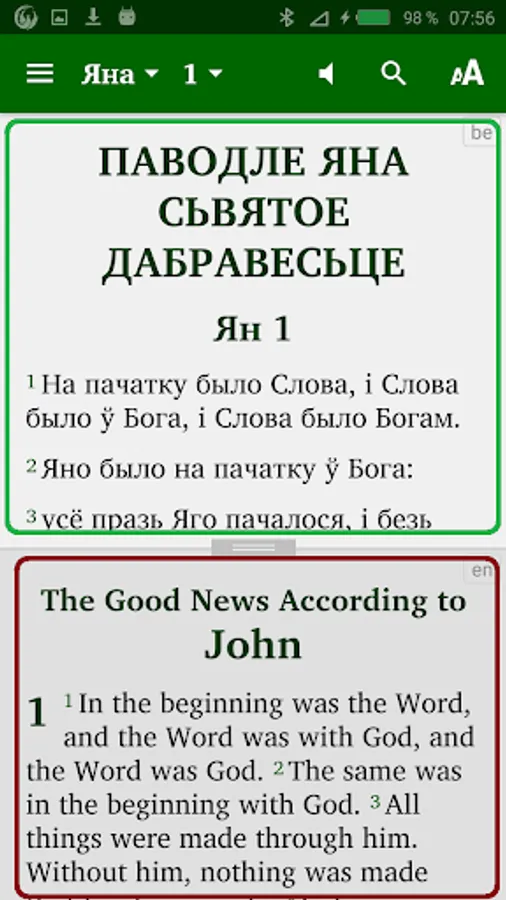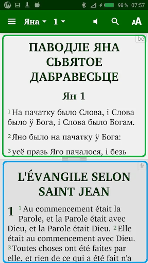 This application presents you the New Testament translated int four languages: Belarusian, English, French and German. For the Belarusian New Testament you can download audio files.
