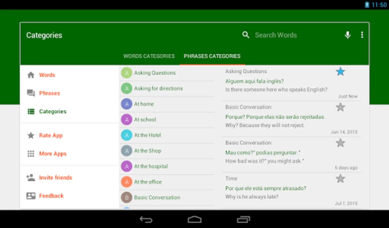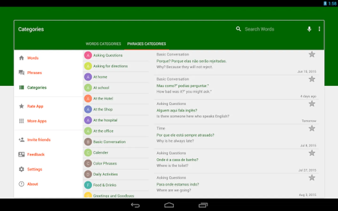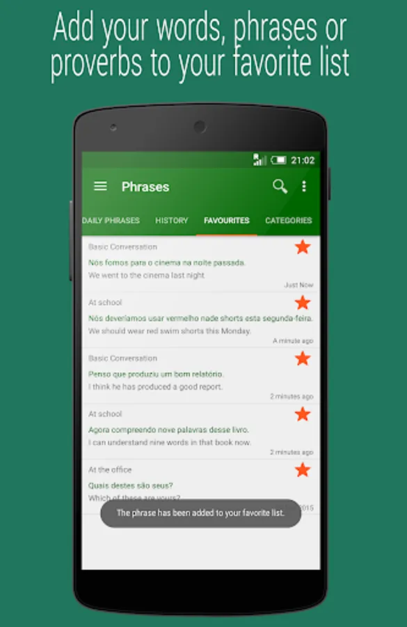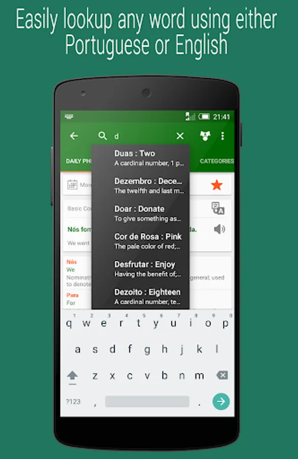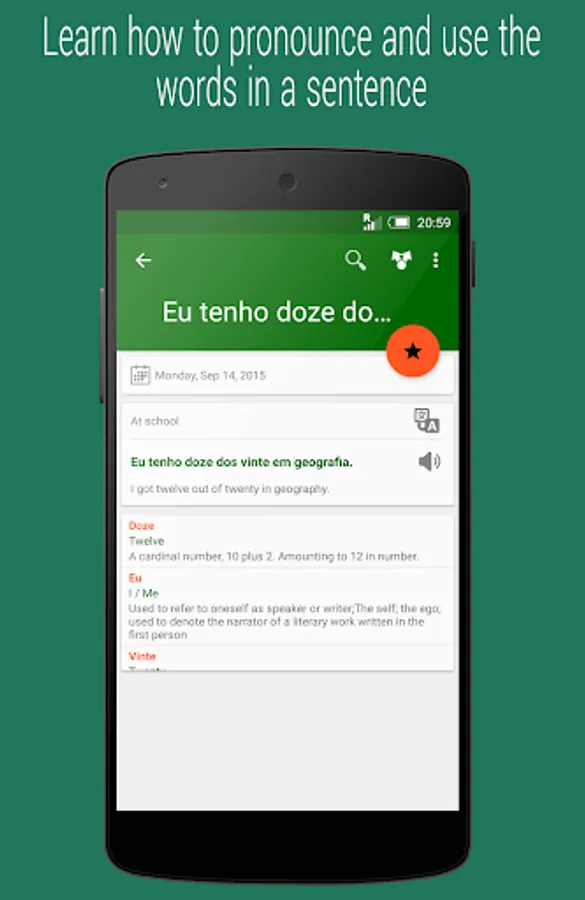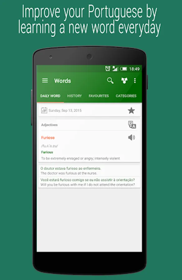 “Daily Portuguese” contains the commonly used Portuguese words and phrases for beginners and intermediate learners. You will receive a notification with a new word or phrase daily. You can practice your speaking and listening skills with the Portuguese pronunciation guide and sounds, wherever and whenever you are. The words are linked to phrases making learning Portuguese much easier as you get along with daily practice and review word usage.