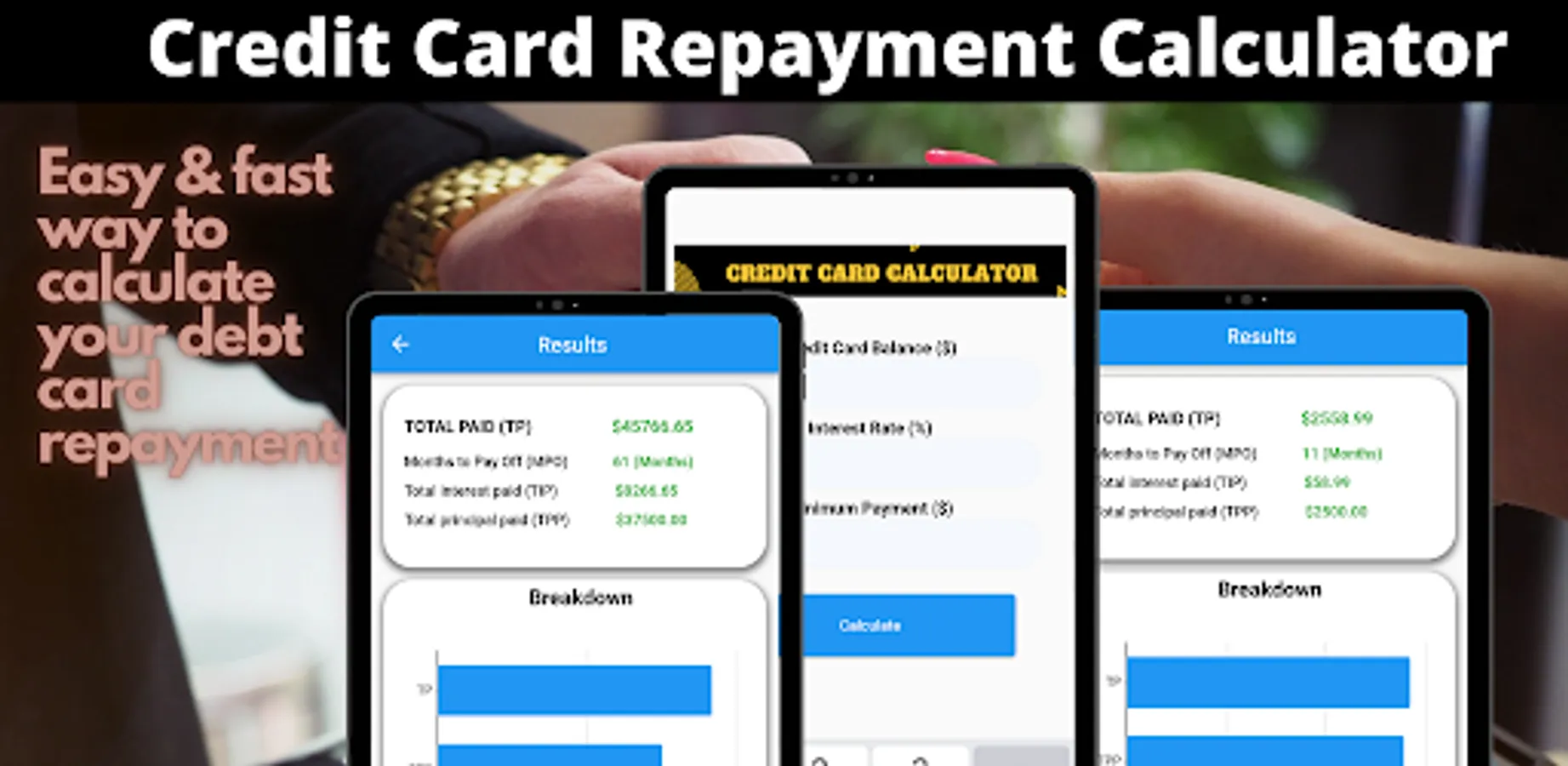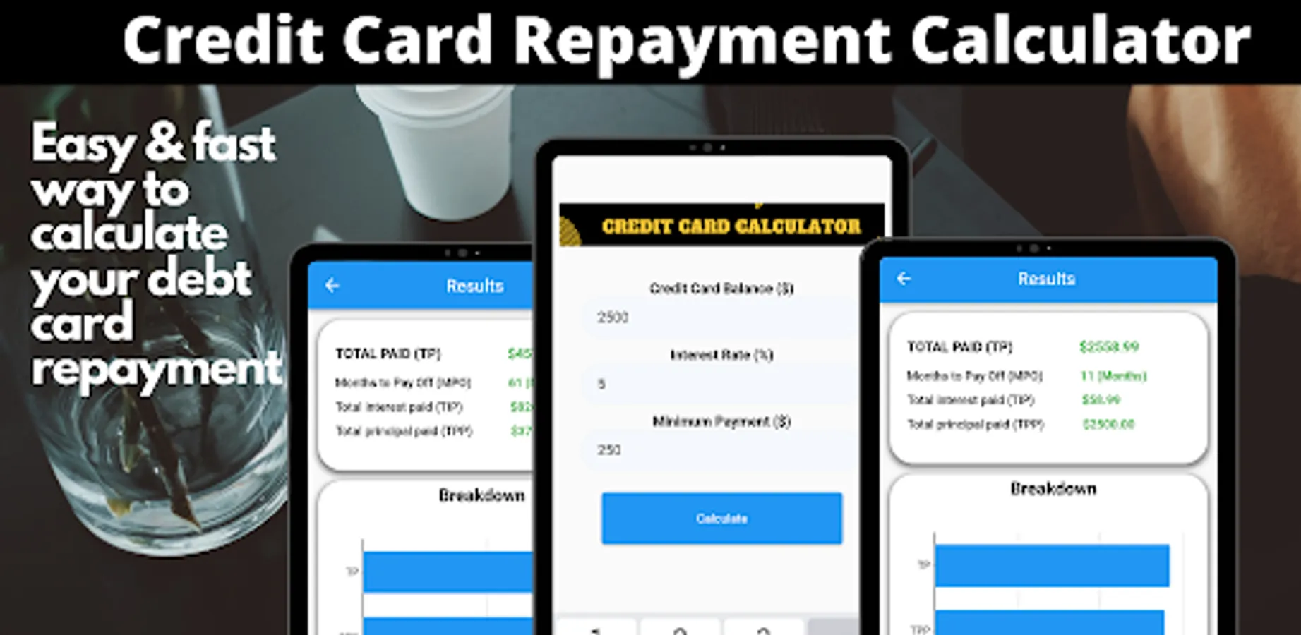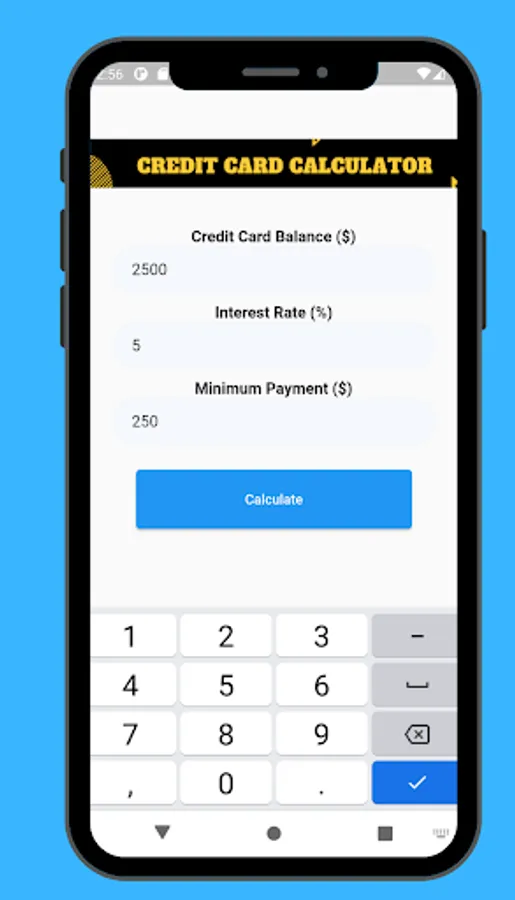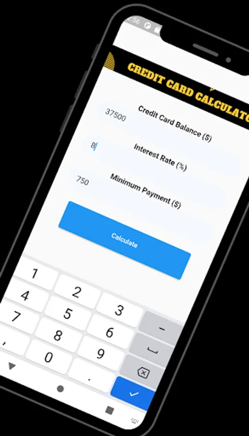 The Credit Card Calculator app is designed to help you with monthly payments for your credit cards. Calculate the minimum monthly payment, APR, and DPR for your credit card balance with this easy-to-use app. Worried about paying your cards off? Download this app now to see how much interest you'll be paying over time with different payment plans!