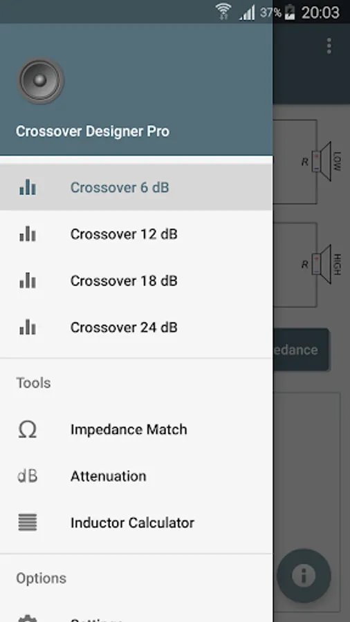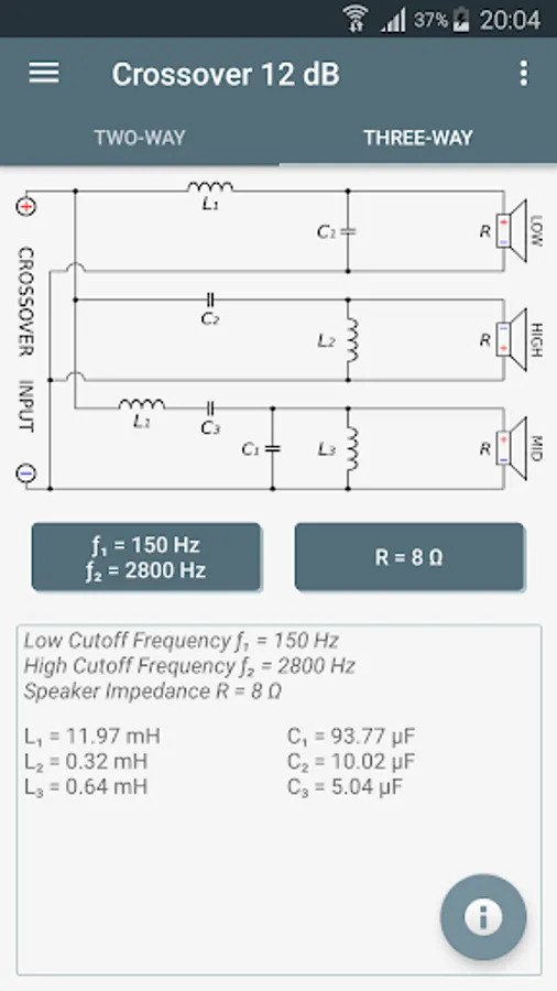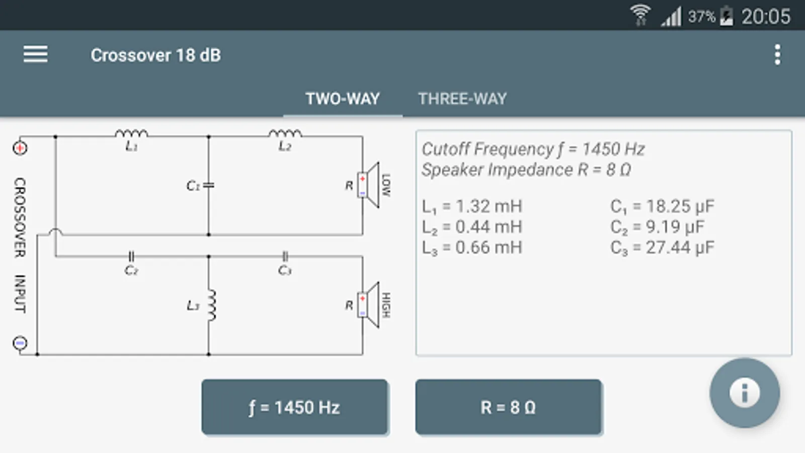 Perfect tool for Crossover Design, allows you to calculate passive crossovers with 6dB, 12dB, 18dB and 24dB /octave slopes.
