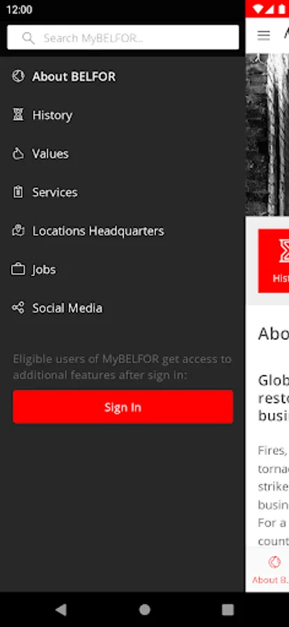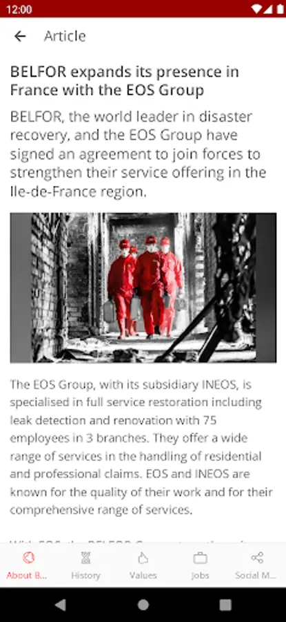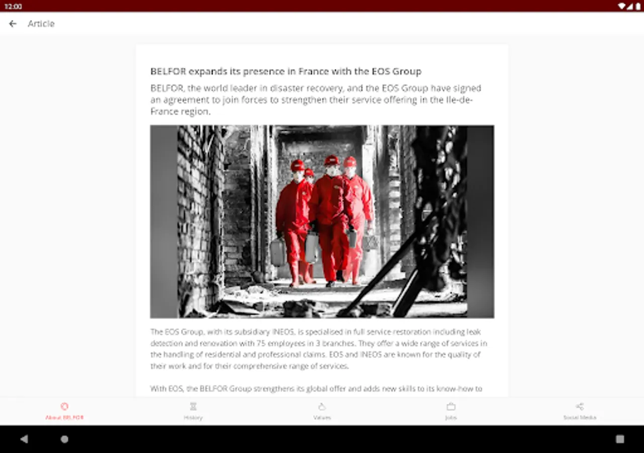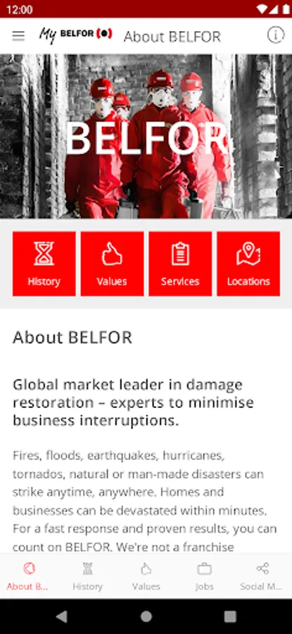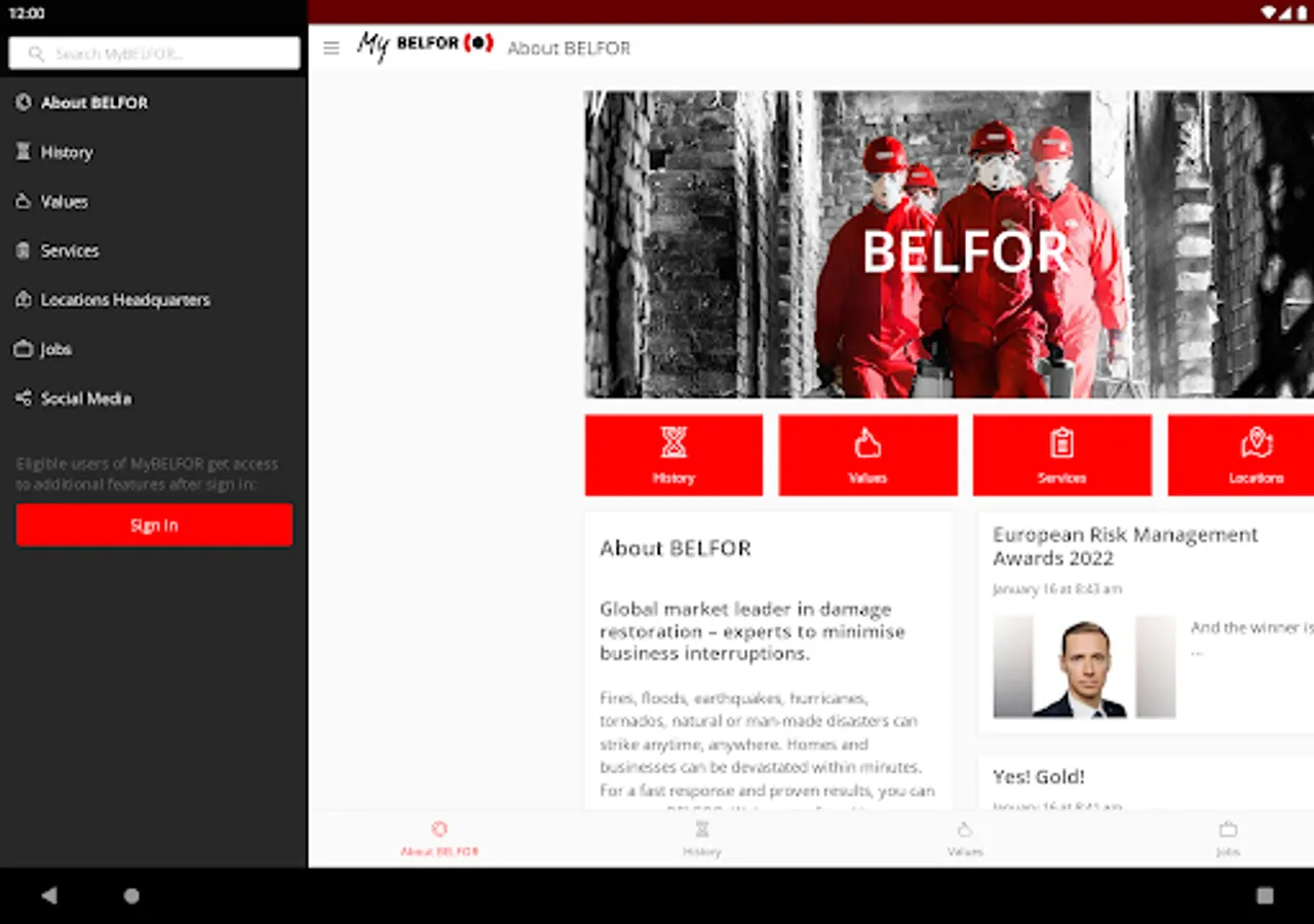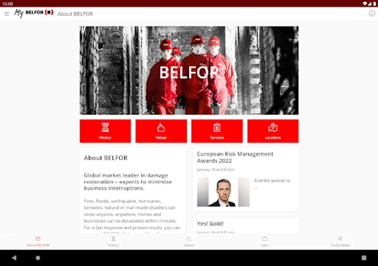 The app provides insights into the world of damage restoration at BELFOR - mobile, fast and up-to-date. It constantly offers new information about the company and its services. It is supplemented by an overview of our locations worldwide and an insight into our history. All this is available in the MyBELFOR app!