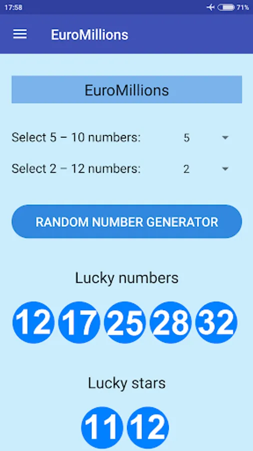 Avec cette application gratuite vous pouvez choisir des nombres aleatoires pour les jeux Lotto, EuroMillions, Keno, Pick 3 et chaque autre jeu de loto.