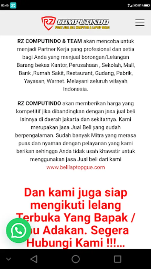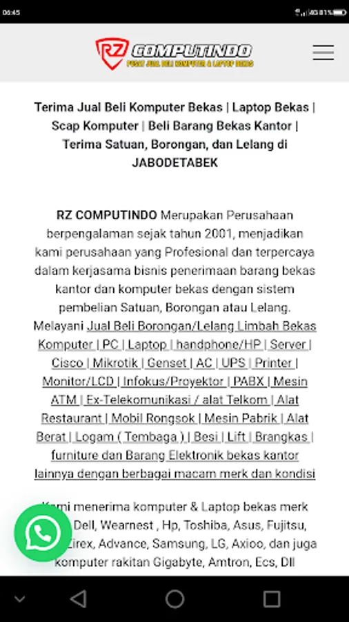 RZ COMPUTINDO is an experienced company since 2001, making us a professional and trustworthy company in the business cooperation of receiving used office goods and used computers with a Unit, Wholesale or Auction purchasing system. Serving Buying and Selling Wholesale / Auction of Used Computer Waste | PC | Laptop | handphone / cellphone | Server | Cisco | Mikrotik | Genset | AC | UPS | Printer | Monitor / LCD | Infocus / Projector | PABX | ATM machine | Ex-Telecommunications / Telkom tools | Restaurant Tools | Rongsok Car | Machinery Factory | Heavy Equipment | Metal (Copper) | Iron | Elevator | Strongbox | furniture and other used office electronic equipment with a variety of brands and conditions