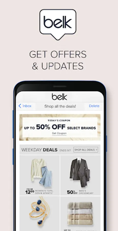 Get push notifications on your phone to be the first to know about great deals and our latest coupons. You can earn and redeem Belk Bucks when you shop in the app, too!