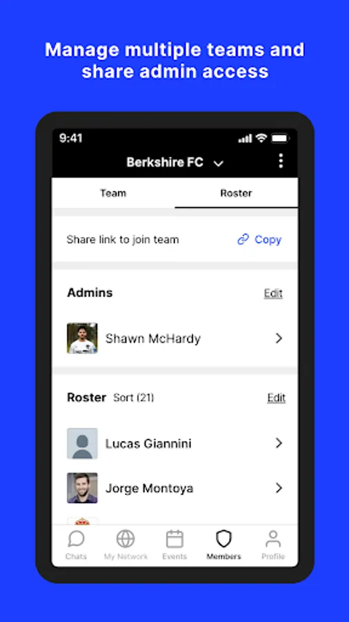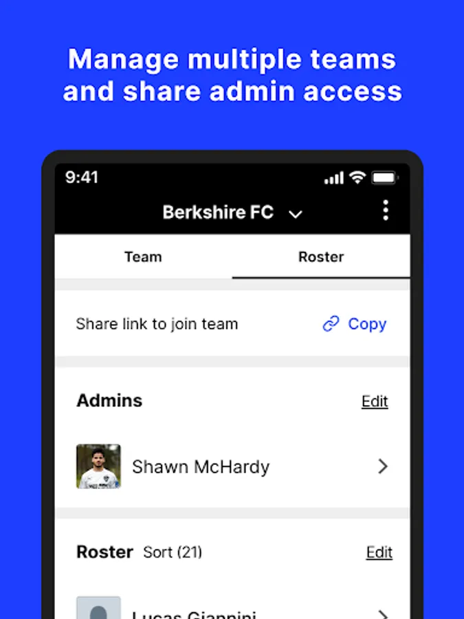 - Invite others to be team admins and manage your roster, lineups, and events.