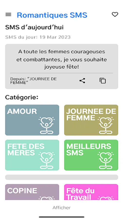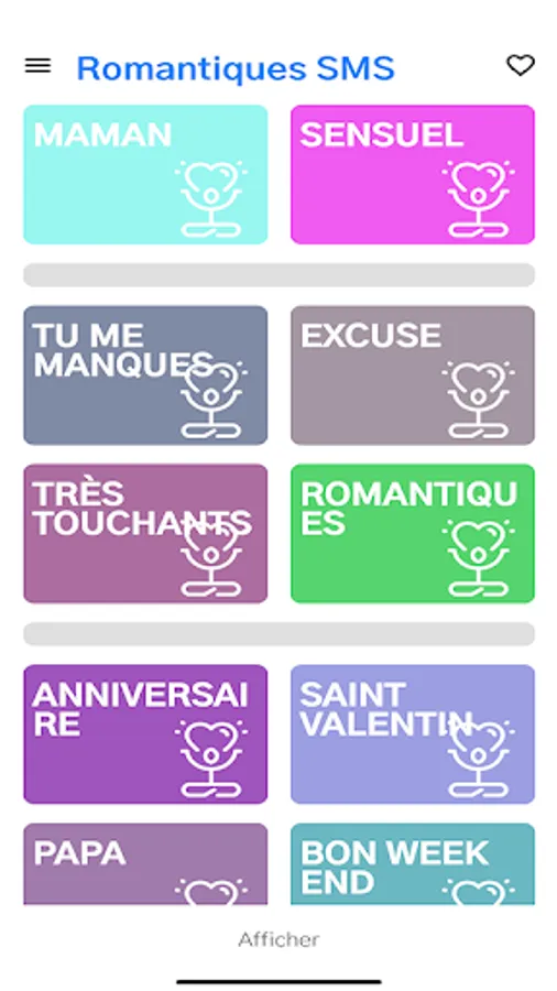 Imagine a mobile app called "SmS D'Amour en français" that lets you read and write love letters in French. When you open the app, you are greeted by a user-friendly and aesthetically pleasing interface, which invites you to explore the different categories of love letters.