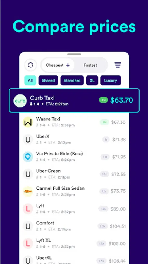 Our app gives you access to all the major rideshares and taxis across the USA and globally. Through our platform you can compare all the leading rides including Uber, Lyft, Ola, Via, Bolt, Curb, Taxify, Cabify, Le Cab, FreeNow, Kapten, Kabbee and dozens of other rideshare, black car and taxi providers.