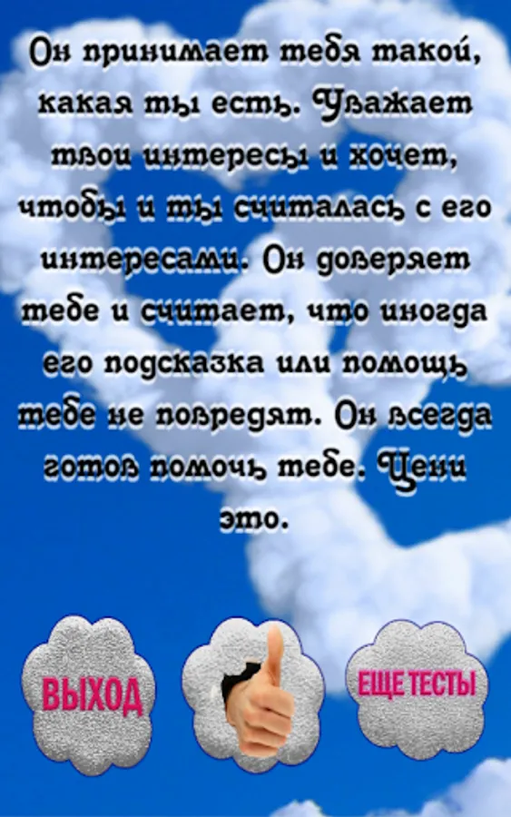 So you want to know the whole truth, it belongs to you is your boyfriend? You have a lot of doubts! After all, even his declaration of love does not guarantee anything! What if you just use? Or maybe he really loves you, although it does not say so? Do you want to recognize love, friendship, affection, or to understand that you are not alone on the road? Then this test is for you! Answer the questions as honestly, to get real results!
